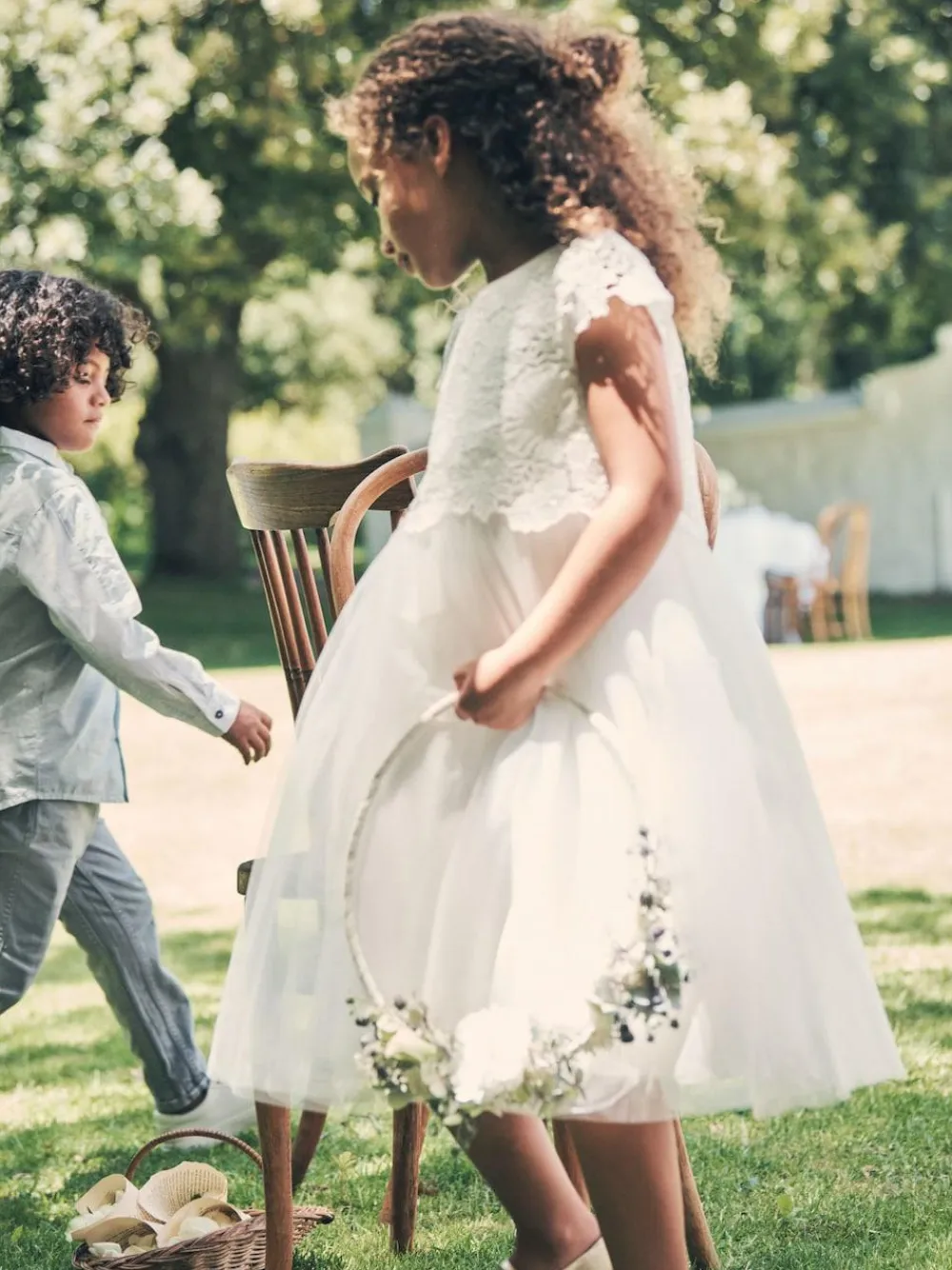 Your flower girl will look utterly enchanting in our new Esme dress. The delicate lace bodice is adorned with shimmering sequins, adding a touch of sparkle and elegance. The layers of twirl worthy tulle ensure the skirt billows gracefully creating a fairy tale aesthetic. This dress combines the beauty of lace, sequins and tulle to make your bridesmaid feel like a princess on this special day. Machine washable. 100% Nylon.