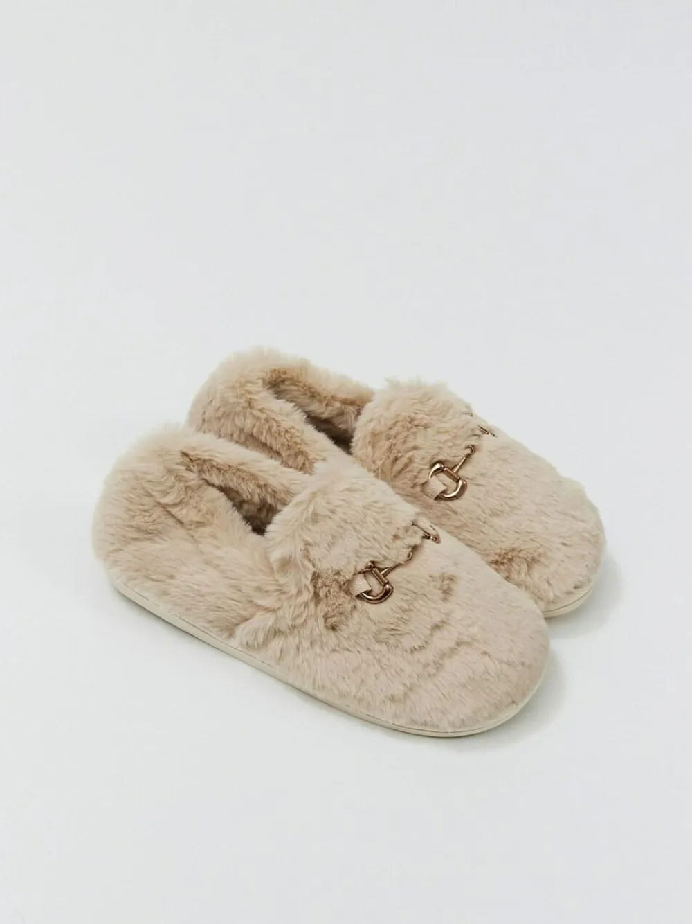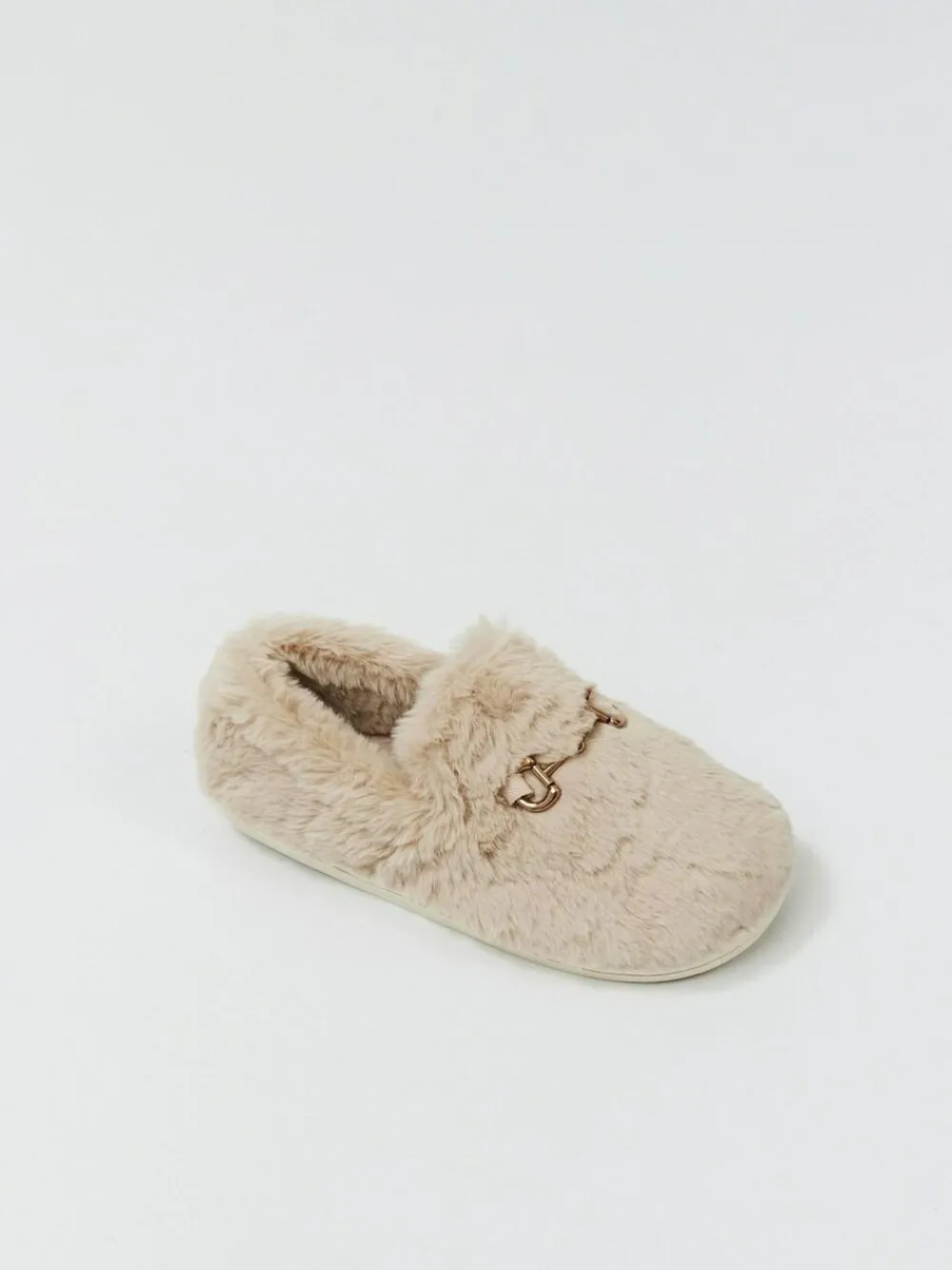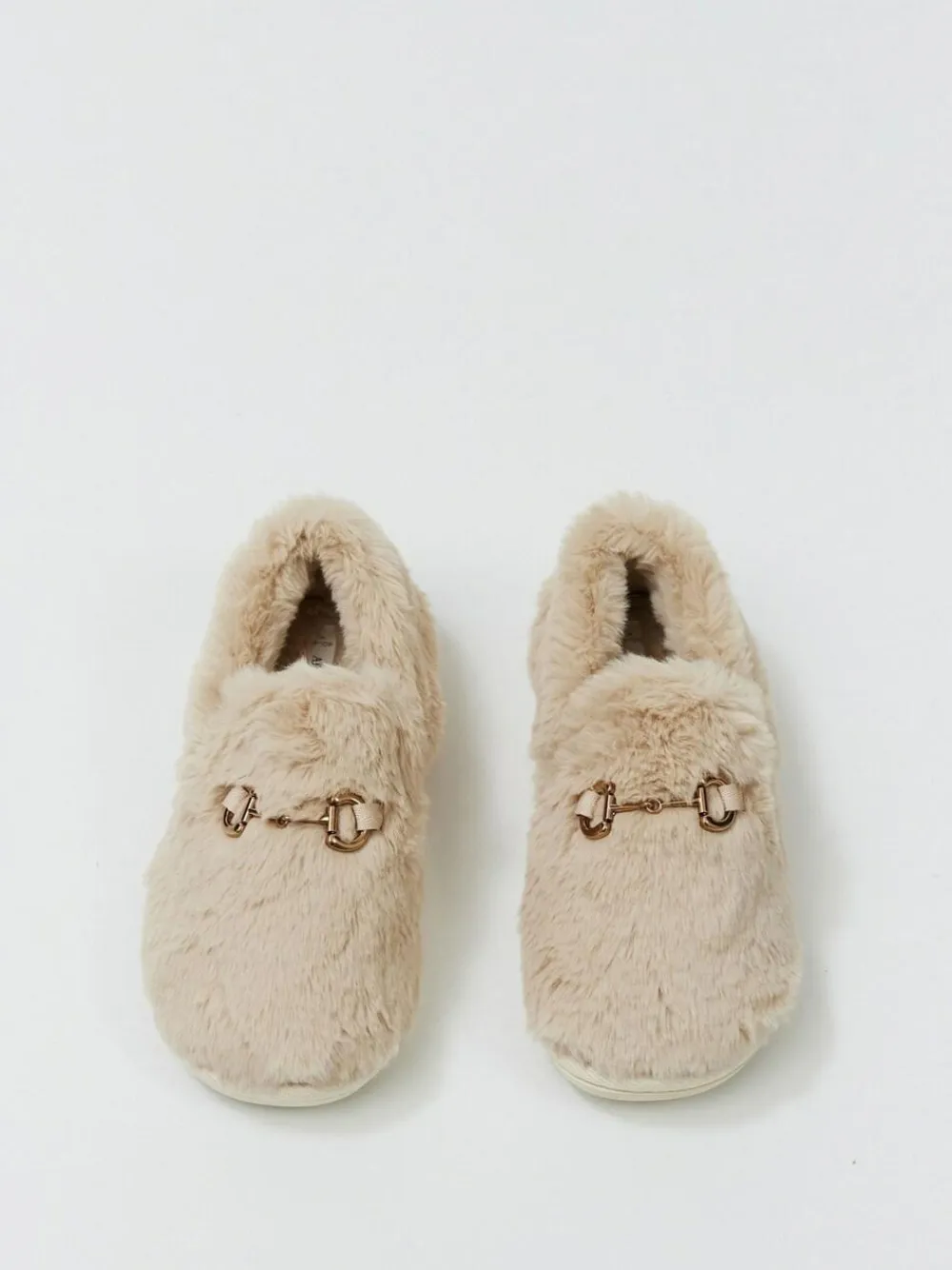 Introducing the Serene Slippers, luxurious comfort in every step! Camel brown slippers with enclosed toes and heels for warmth. Extra soft, fluffy polyester fabric for a cozy feel. Cream elastic PVC compound sole ensures durability and traction. Delicate decorative detail in gold-tone adds an elegant touch. Designed for unwinding in style after a long day. Upper – 100% Polyester, Lining. and Sock – 100% Polyester. Sole – 100% Rubber.