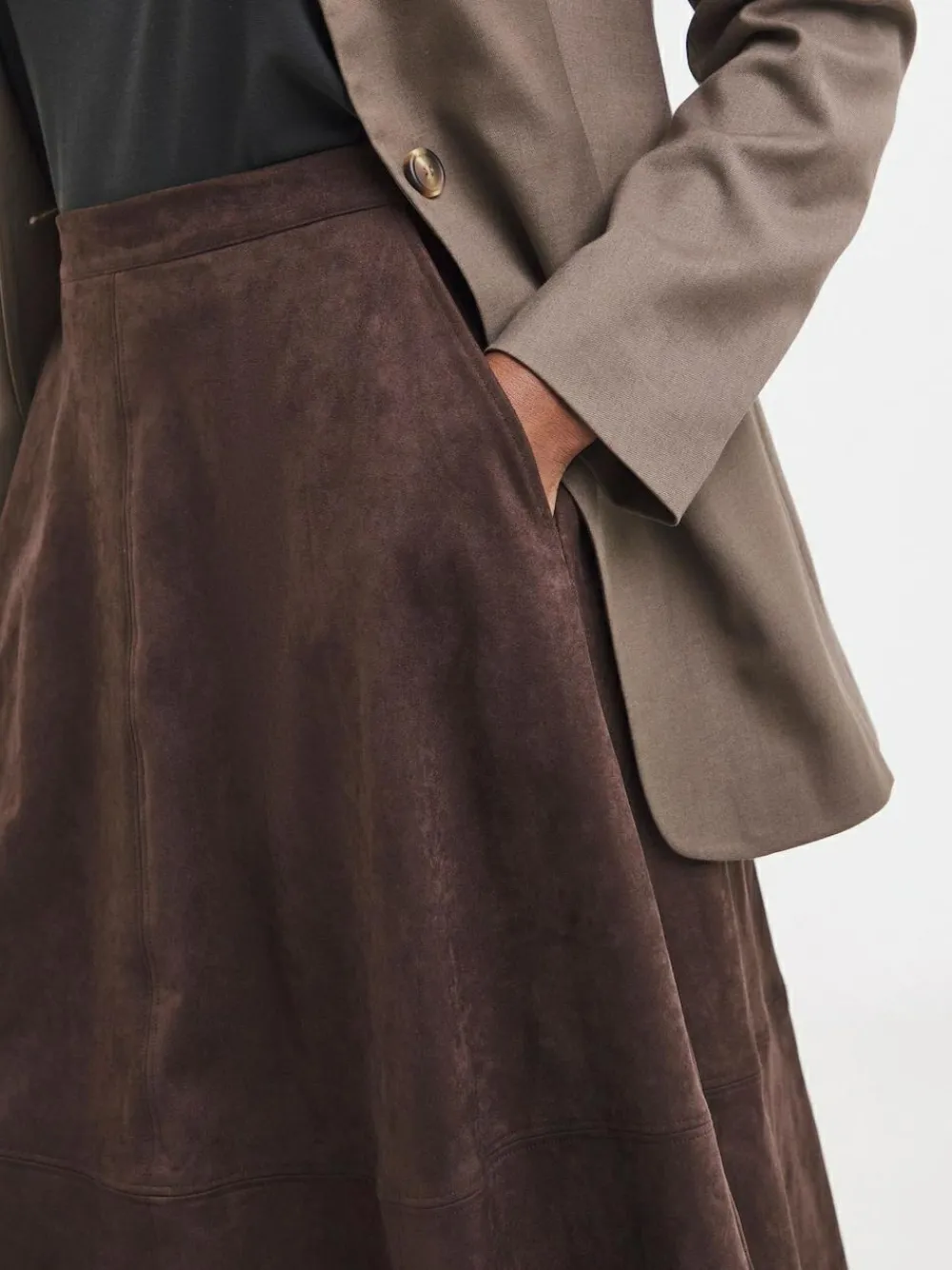 This fashionable suede midi skirt is perfect for any occasion. A timeless piece made for stylish everyday dressing. Regular waistband to hem 33.5″ / 84.5cm. Hand wash only. Shell 87% Polyester, 13% Elastane. Lining 95% Polyester, 5% Elastane.