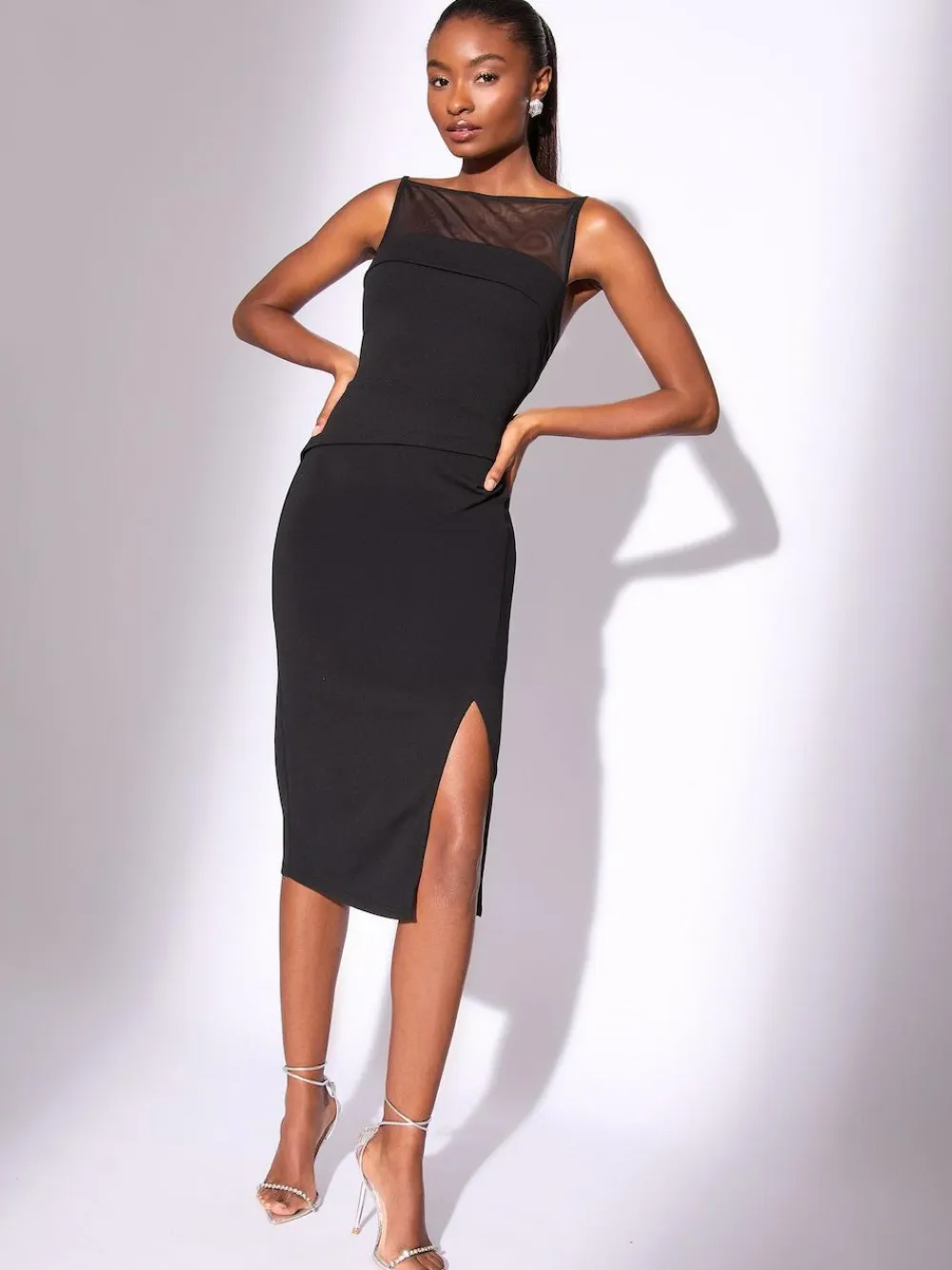 Achieve sophisticated glamour in this sleek sleeveless bodycon midi dress. Crafted from sculpting scuba fabric, the figure-flattering silhouette features a daring side split and elegant mesh yoke detail at the neckline. Perfect for day to night transitions, this dress is essential occasionwear for dinner dates and formal events. Mesh yoke detail Sculpting scuba fabric Sleeveless bodycon fit Midi length with side split Occasionwear Main 96% Polyester, 4% Elastane. Mesh 92% Polyester, 8% Elastane. Lining 100% Polyester.