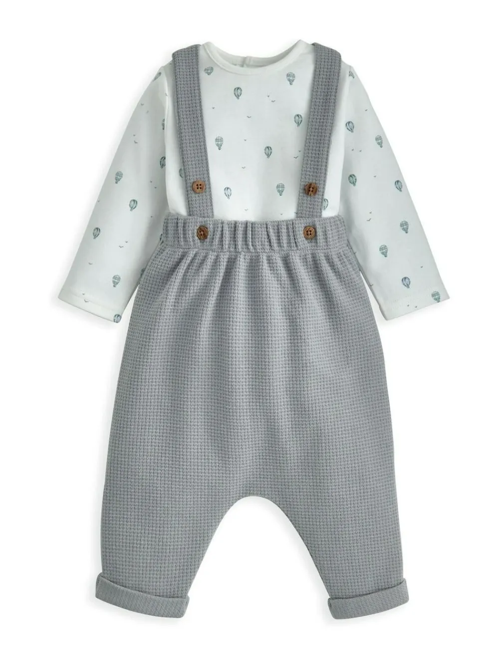 The perfect coming home collection, this beautiful range of timeless quality newborn clothing is designed to nurture your little one. Welcome to the World brings together gentle materials with relaxed fits, in comfortable clothing for baby during their first weeks in the world. This 2-piece set with a hot air balloon print is a perfect outfit for your little one. The all-over hot air balloon print bodysuit features popper openings at the shoulder and gusset for easy dressing. The blue waffle dungaree has adjustable button straps, an elasticated waistband, and turn-up cuffs for added style and comfort. Full Washing Instructions: 40 degree wash, do not bleach, cool tumble dry, cool iron, do not dry clean, wash dark colours separately, iron on reverse. Machine washable. Shell 100% Cotton. Trim 95% Cotton, 5% Elastane.