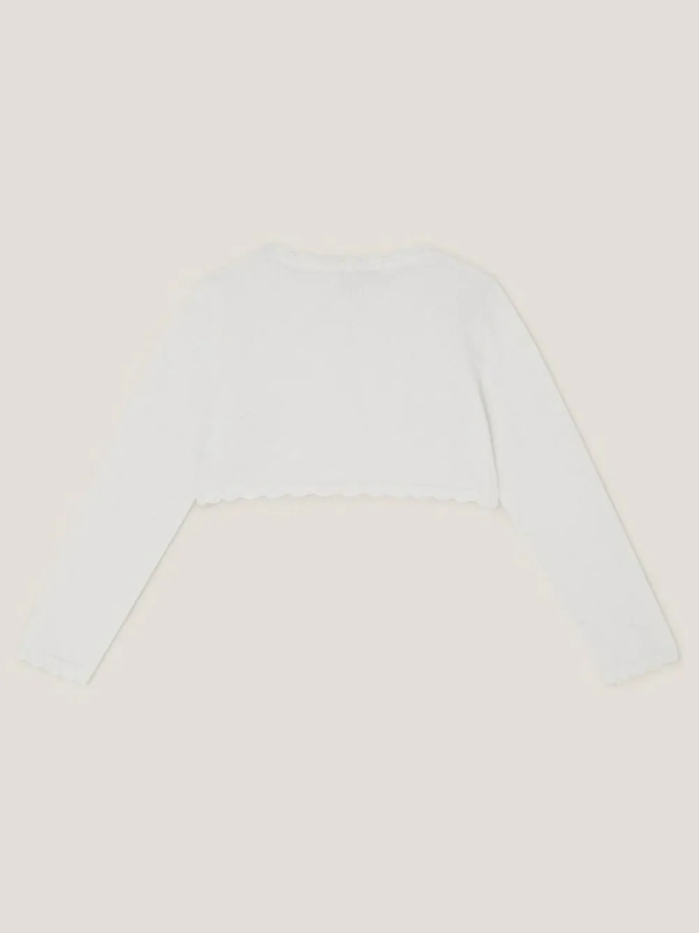 Take a bow. A cosy cute layer for all their party dresses, this cropped cardigan is designed with pointelle hems and a gold-tone bow button at the neckline. Machine washable. 70% Cotton, 17% Polyester, 13% Nylon.