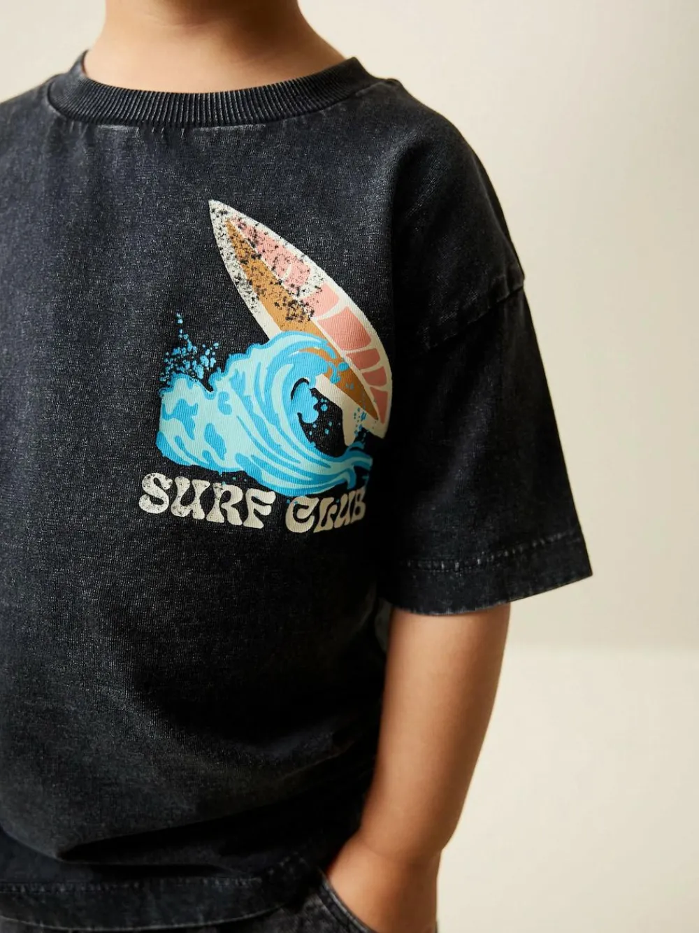 Power up his everyday look with this fun Black Acid Wash short sleeve T-shirt, perfect for comfortable casual wear and action-packed playtime. Featuring a cool back Surf Club print graphic and a smaller detail on the chest pocket, this top is a stylish choice for any young mind. Short Sleeve T-Shirt Bold graphics Oversized fit Features a striking Surf Club back print Small print detail on chest pocket Ideal for casual playtime wear Machine washable. 100% Cotton.