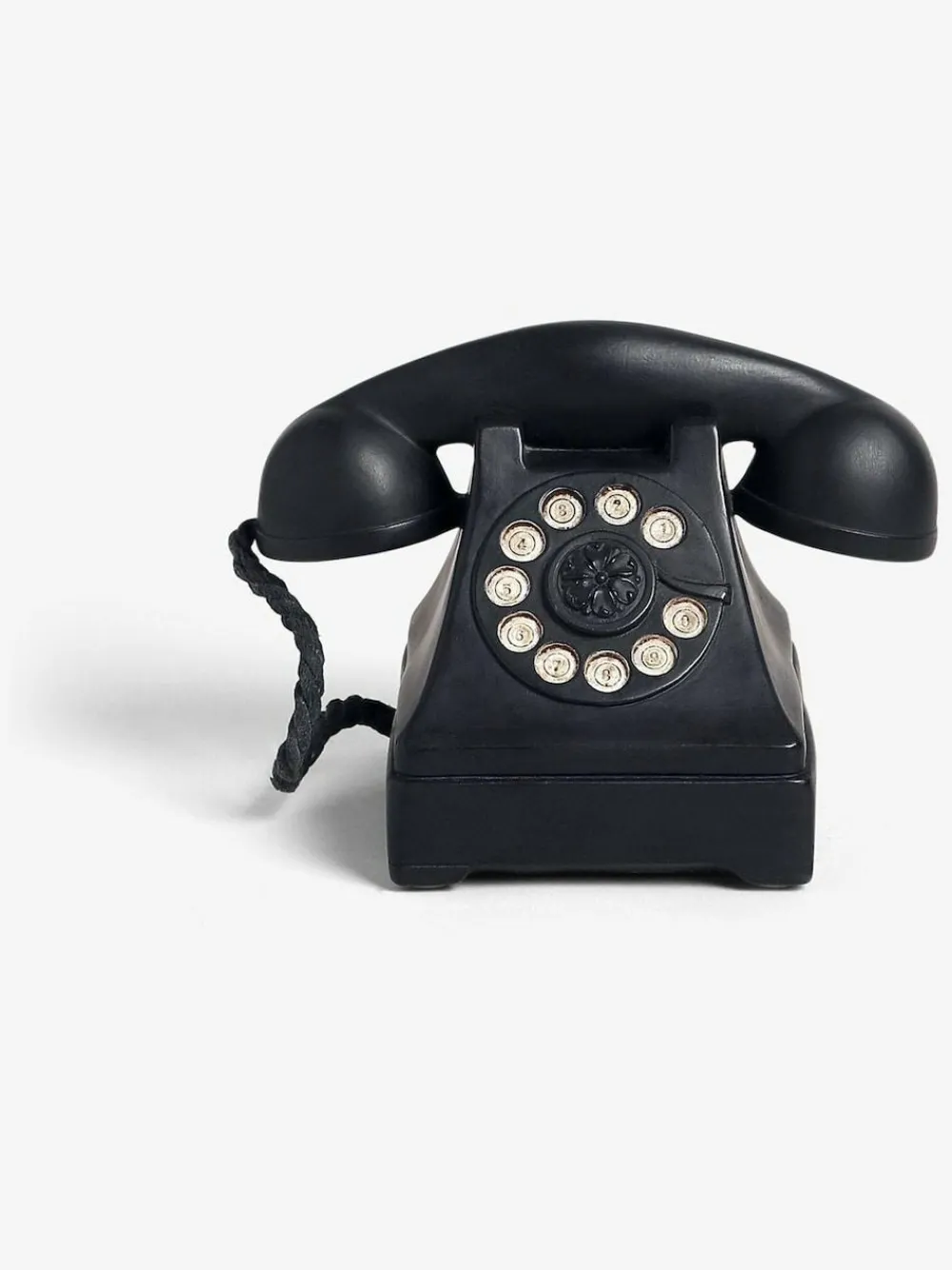 Perfect for mid century interiors, this retro-inspired telephone ornament is perfect for shelves and display cabinets. Height 12.5cm Width 18.5cm Depth 13cm 100% Resin.