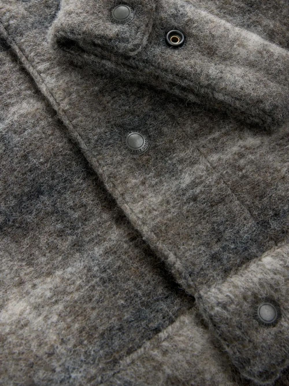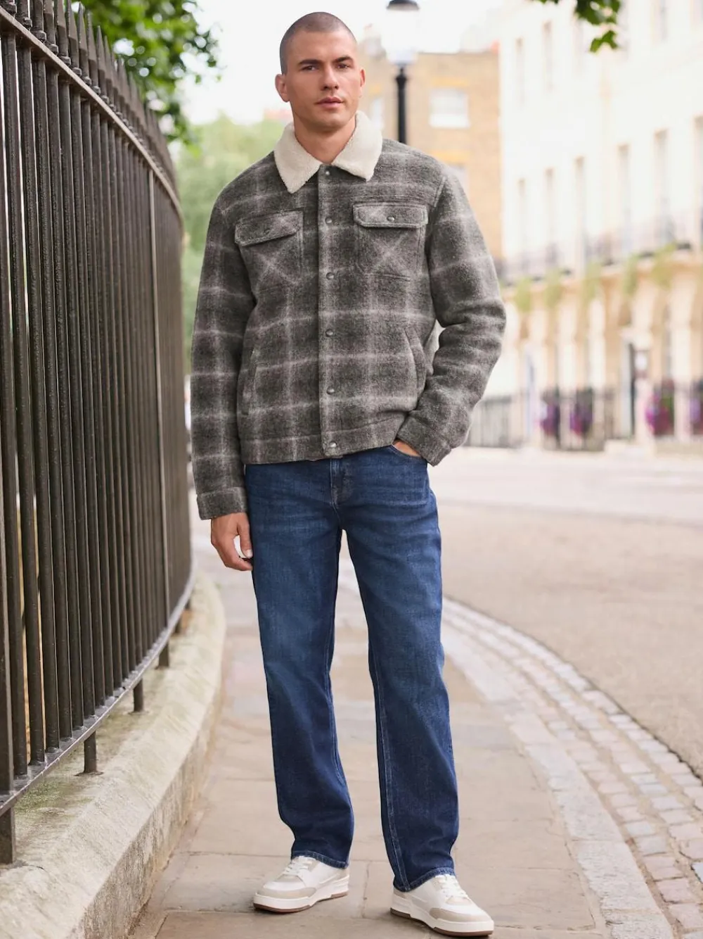 Cosy up in this borg-lined trucker jacket with a check pattern; the perfect blend of warmth and classic style. The soft wool-blend outer and comfortable borg lining make it ideal for layering in cooler weather. Complete with button fastenings and practical pockets, it’s a stylish and functional choice. Wool blend Borg lining Button fastening Two chest pockets Internal pocket Shell 70% Recycled polyester, 30% Wool. Body Lining 100% Polyester. Sleeve Lining 100% Recycled polyester. Wadding 100% Recycled polyester.