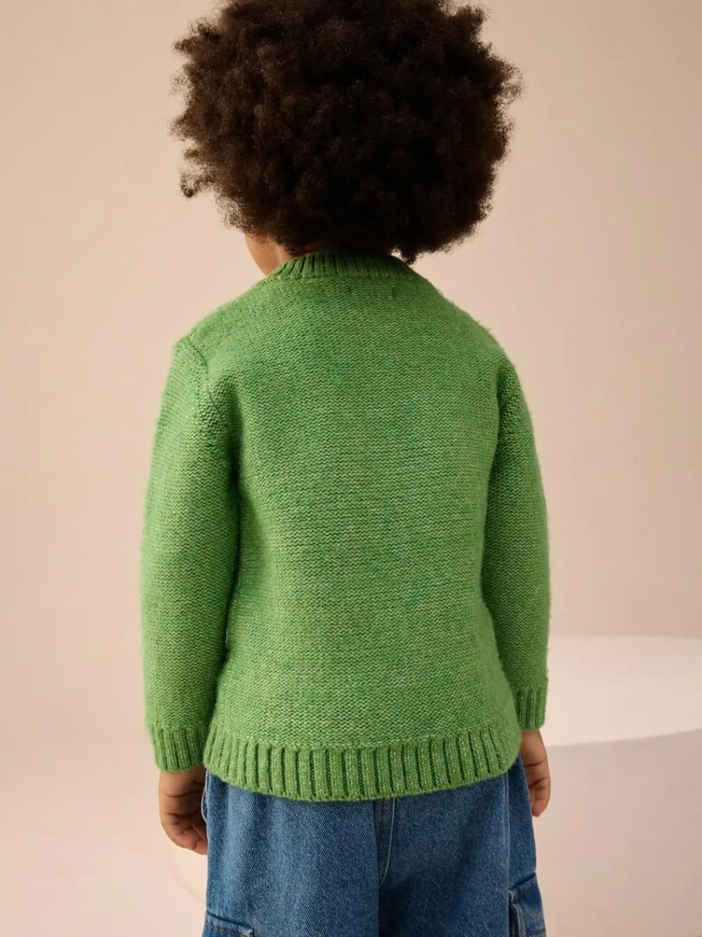 Make his look roarsome with this fun dinosaur knitted jumper, perfect for cosy casual wear and all his adventures. The vibrant green colour and playful dinosaur design ensures he stays warm while showing off his bold style. Knitted Jumper Knitted fabrication Dinosaur graphic design Long sleeve 47% LENZING™ ECOVERO™ Viscose, 47% Recycled polyester, 6% Nylon.