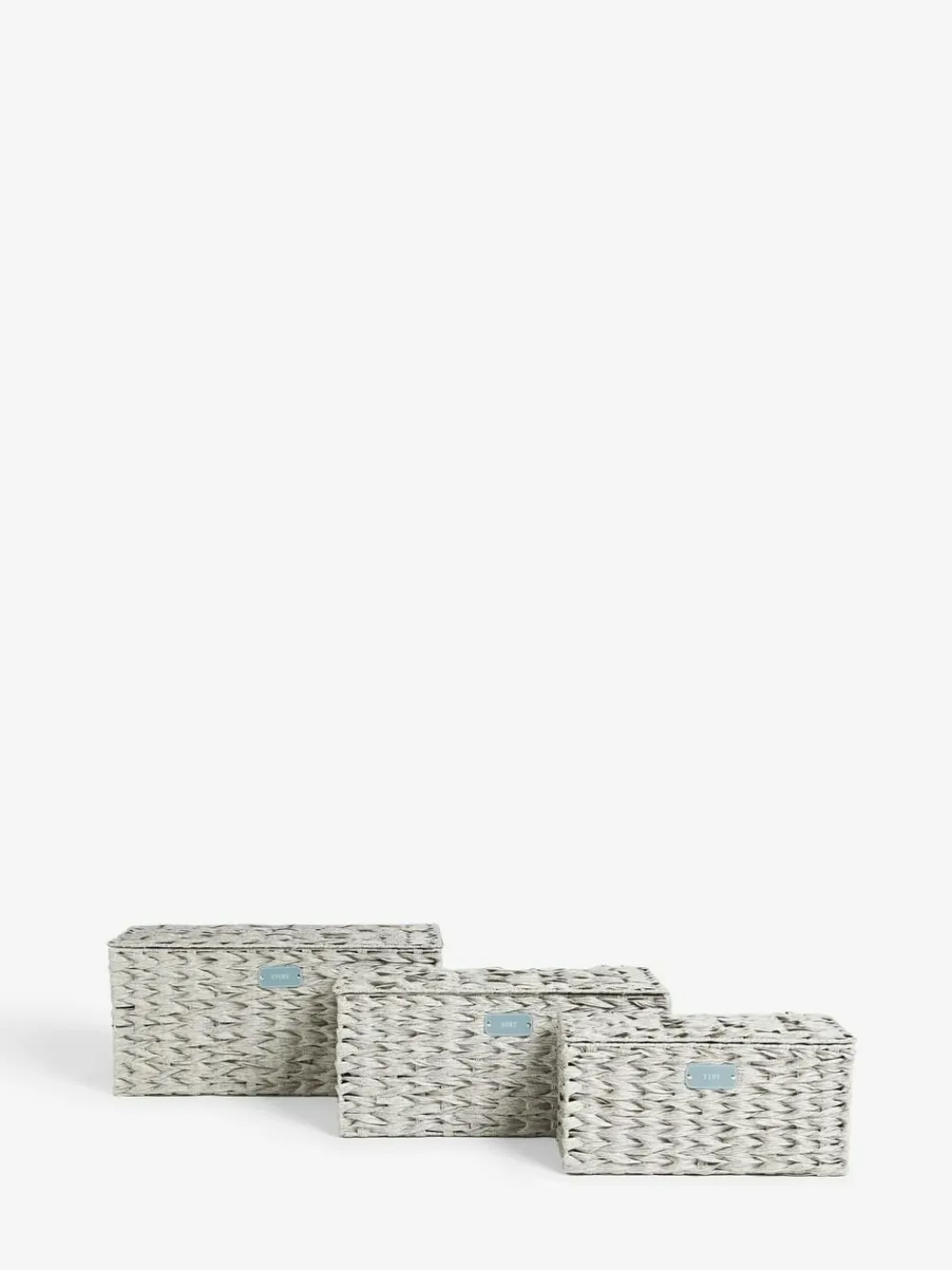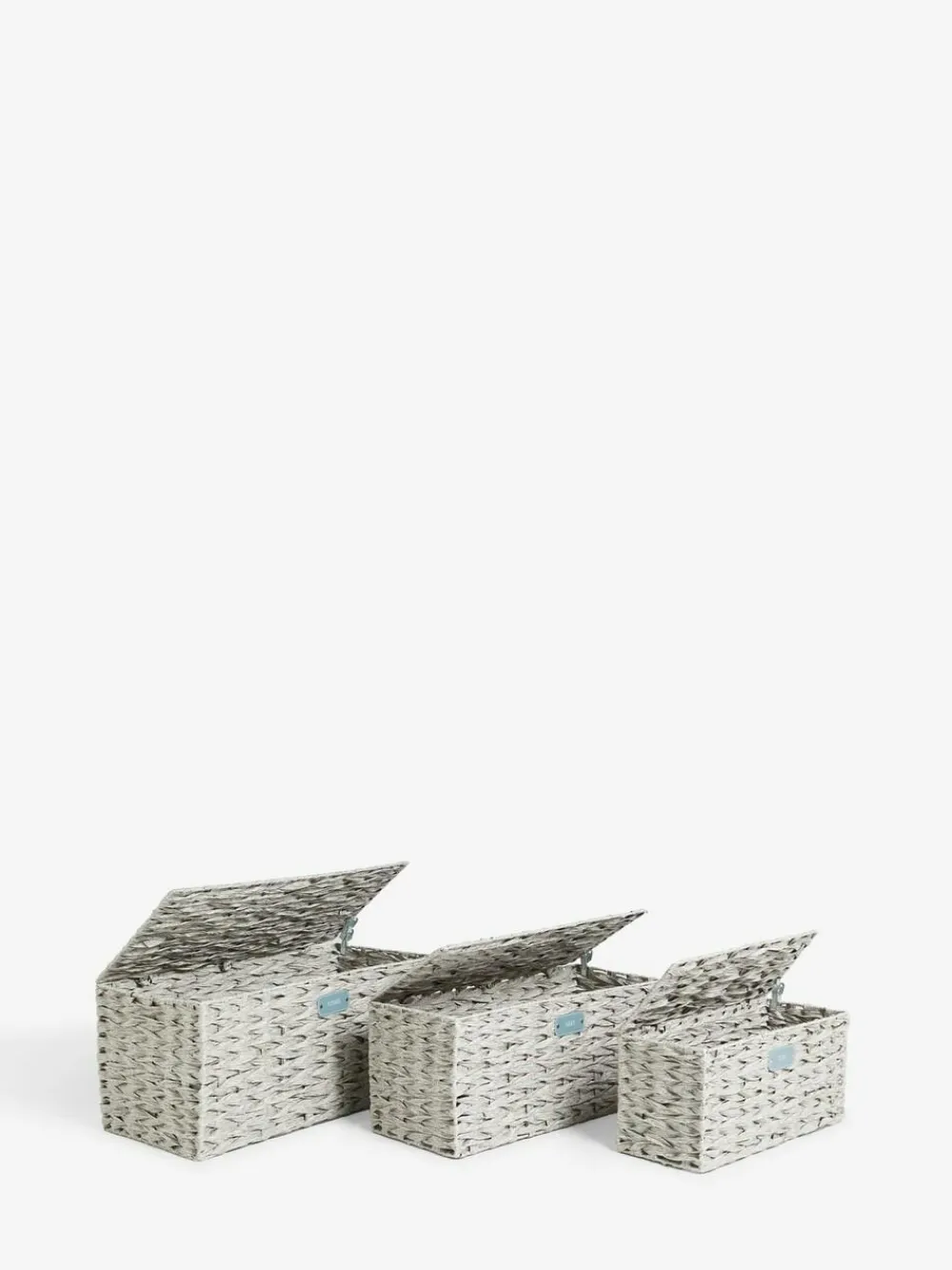 Set of 3 grey baskets made from plastic wicker. Their slimline shape makes it perfect for small spaces. Finished with a lid to hideaway all your clutter, they are easy to wipe clean making it great for use in any area of the home. Set of 3 Plastic wicker Different sizes available Height 32cm Width 35cm Depth 32cm 3 x Storage Box 80% Plastic, 20% Metal.