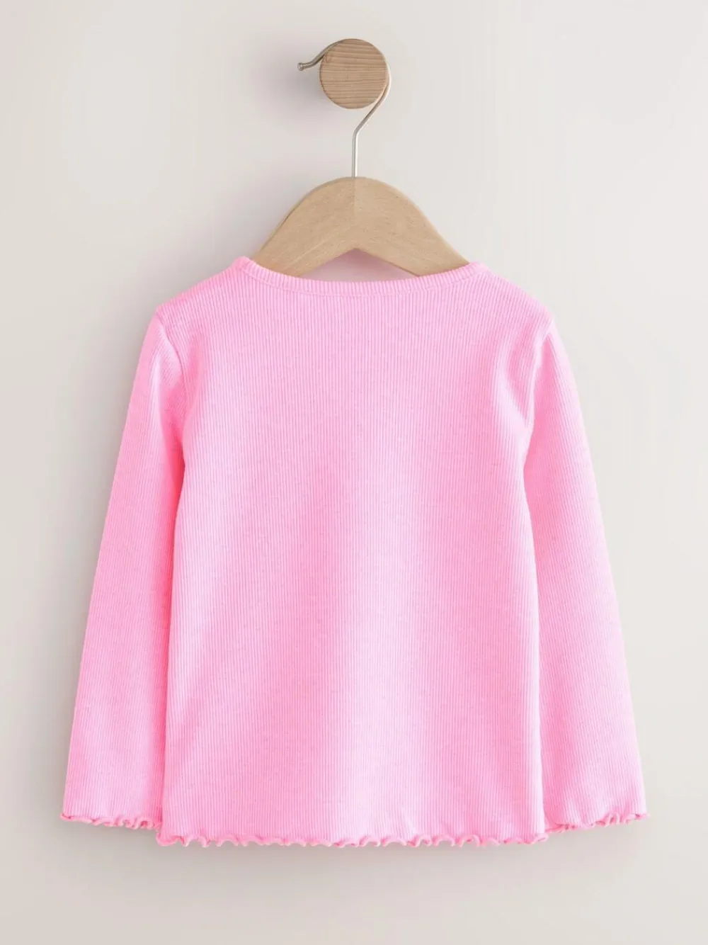Add some fun to their everyday staples, with this Pink long sleeve rib t-shirt, available in a selection of bright colours and prints, set against a cotton-rich base with added stretch. The t-shirt is finished with a ribbed crewneck collar and a ruffle trim the sleeve cuffs and hem. Cotton-rich blend Long sleeves Crewneck collar Ruffle trim Machine washable. 57% Cotton, 38% Recycled polyester, 5% Elastane.