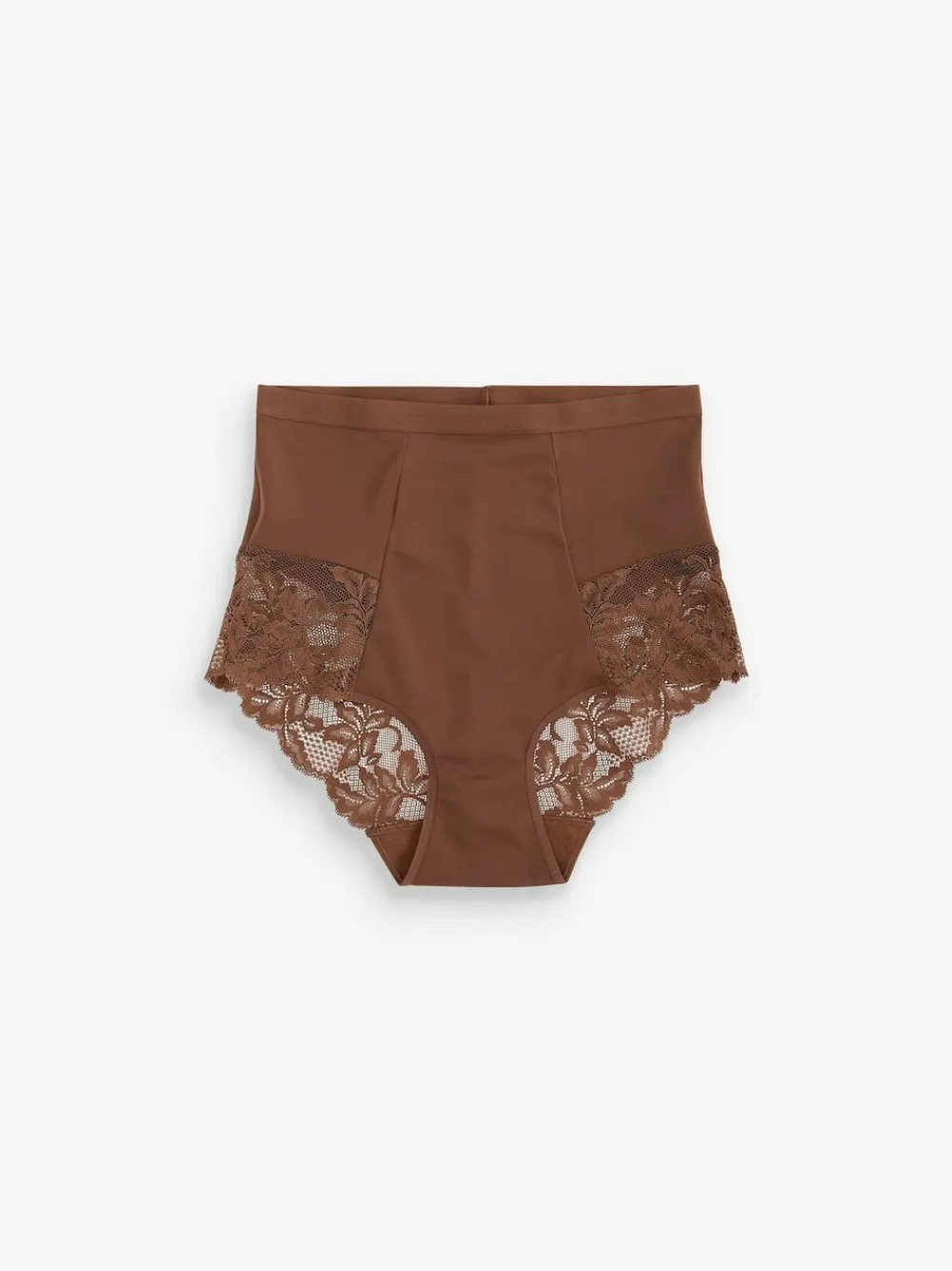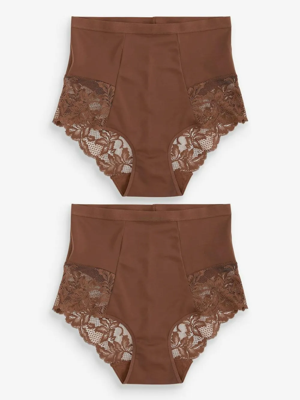 This two – pack of shaping Chocolate Nude knickers is high-waisted for a comfortable and flattering fit underneath any outfit and features soft lace for added feminine detail. Pack of two Lace trim detail Stretch fabric Elasticated waistband High waist Tummy control Cotton gusset Machine washable. 2 x Knickers Main 68% Nylon, 32% Elastane. Gusset 100% Cotton. Items with the curve logo are available in sizes 18 and above.
