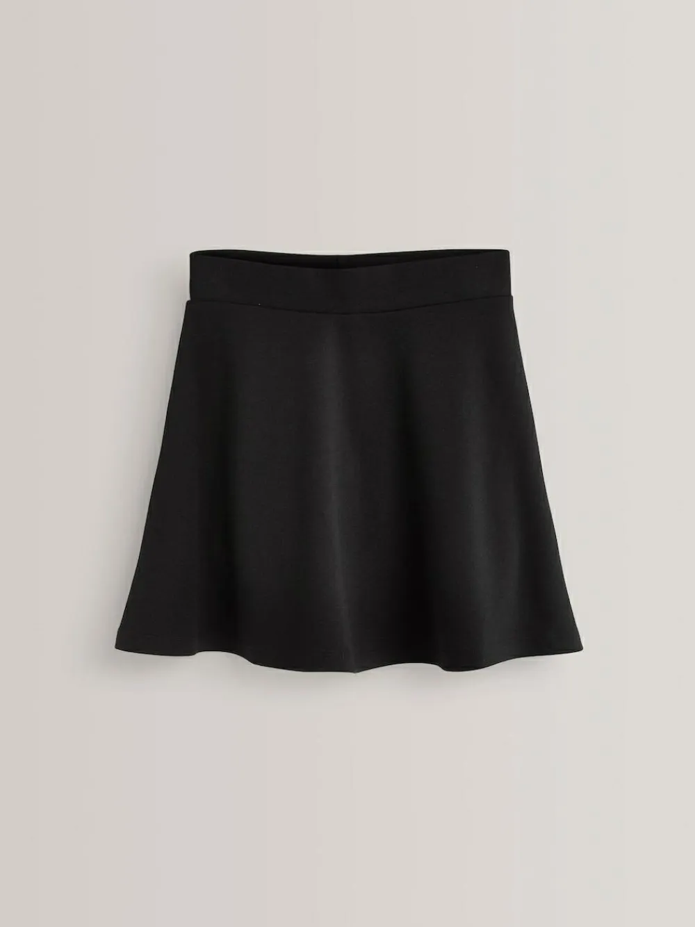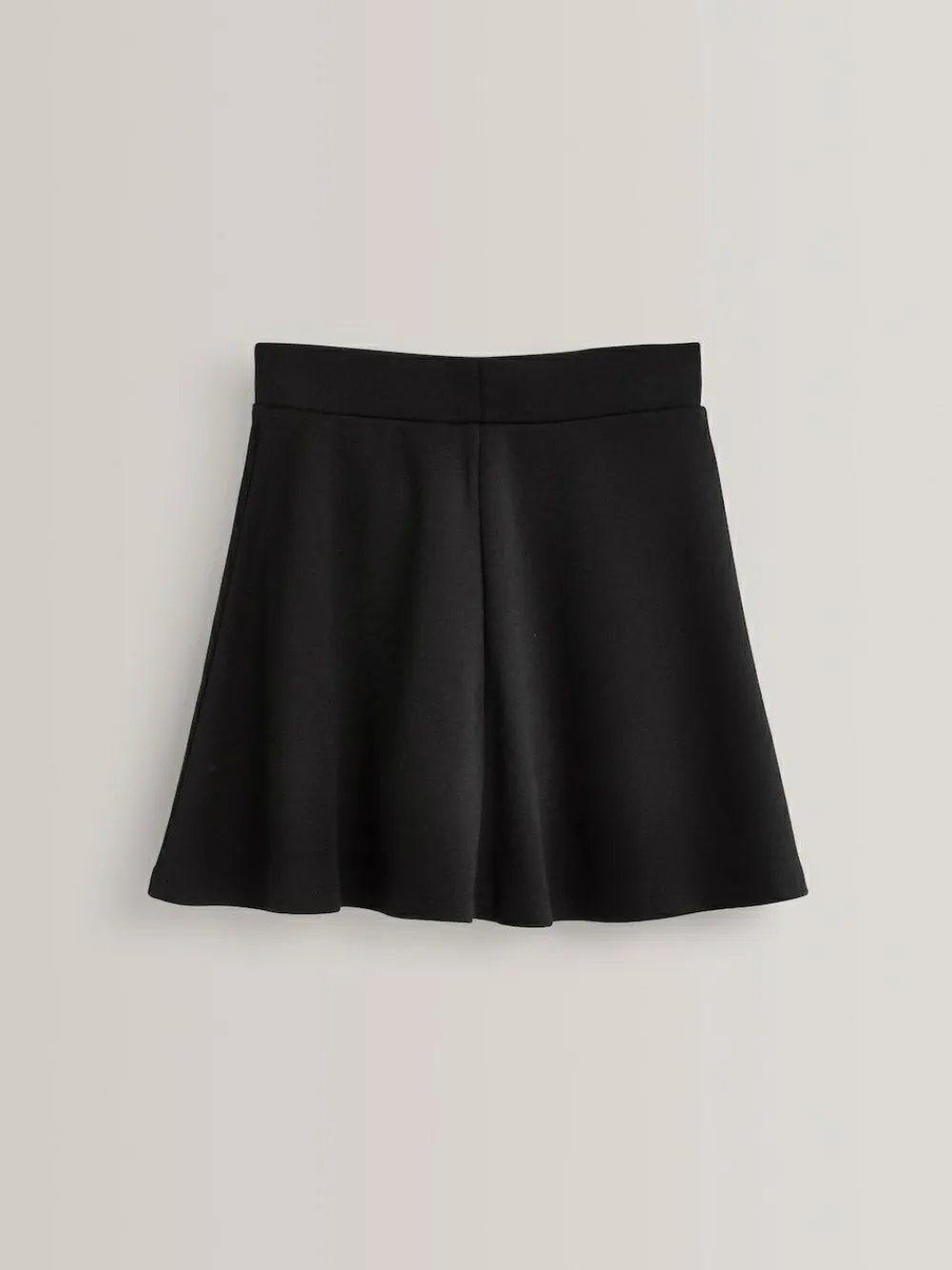 Take the stress out of school mornings with our Dressing Made Easy School Uniform Collection. Featuring pull on trousers, skirts and dresses alongside hidden touch fastenings, printed labels and elasticated waists. Getting ready for school has never been easier.The perfect addition to their school wardrobe. This black skater skort is designed with stretch jersey fabric and a pull on feature for all day comfort and to make dressing in the morning super easy. For extra modesty this skort has an intergrated stretch short. Key Features: Stretchable jersey fabric Skater style skirt Integrated modesty short Pull-on style Machine washable. Skirt 75% Recycled polyester, 22% Viscose, 3% Elastane. Inner 92% Cotton, 8% Elastane.