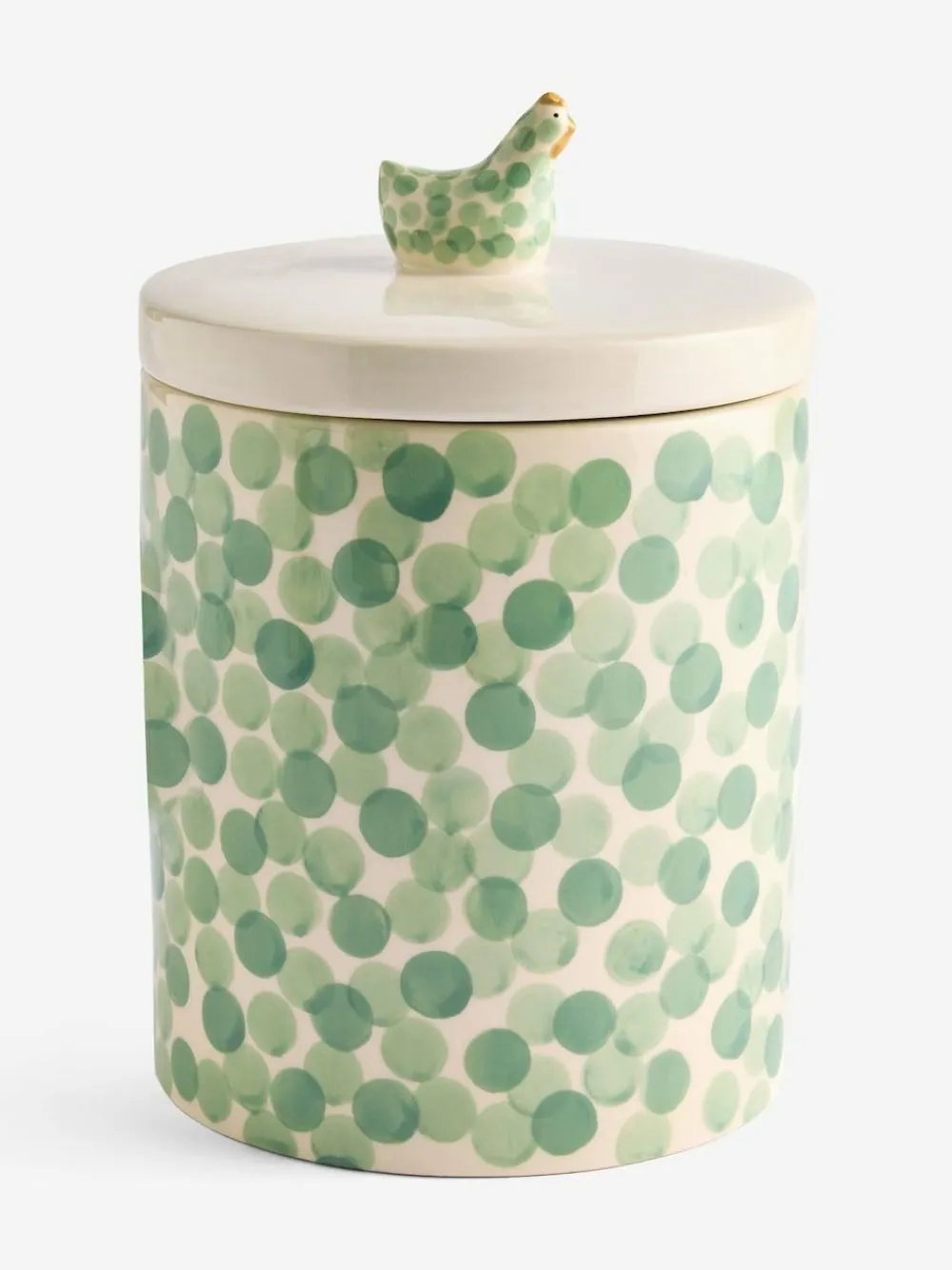 Store your treats in style with this ceramic jar featuring a sage spot pattern and a charming chicken topper. Ideal for keeping your worktop tidy and your goodies within easy reach. Height 22cm Width 14.5cm Depth 14.5cm Hand wash only. 100% Ceramic.