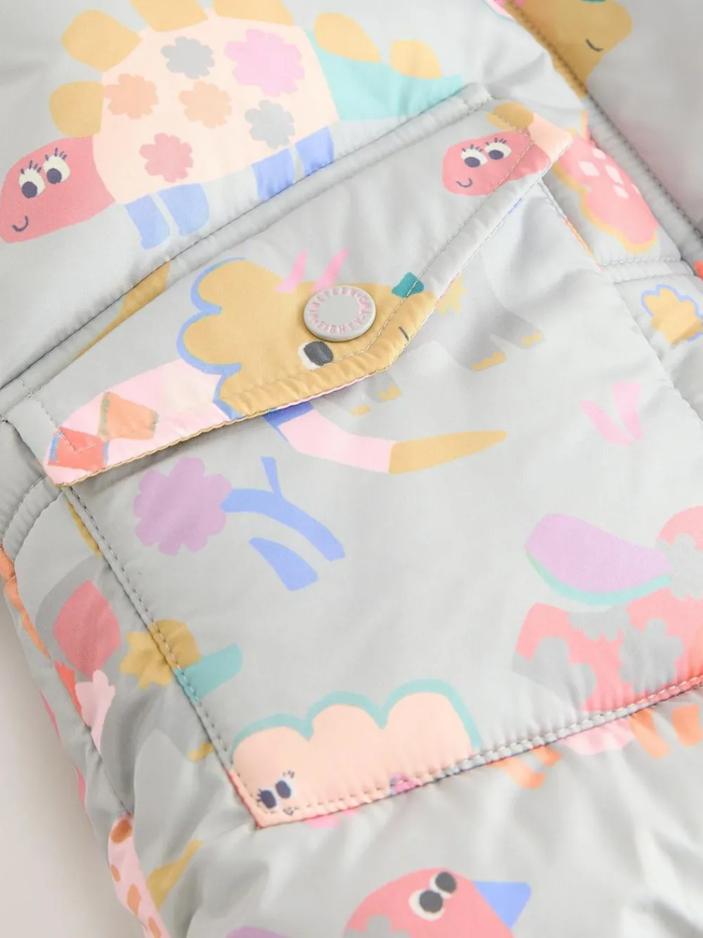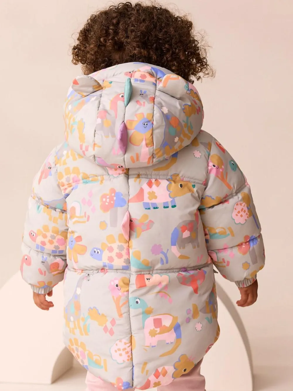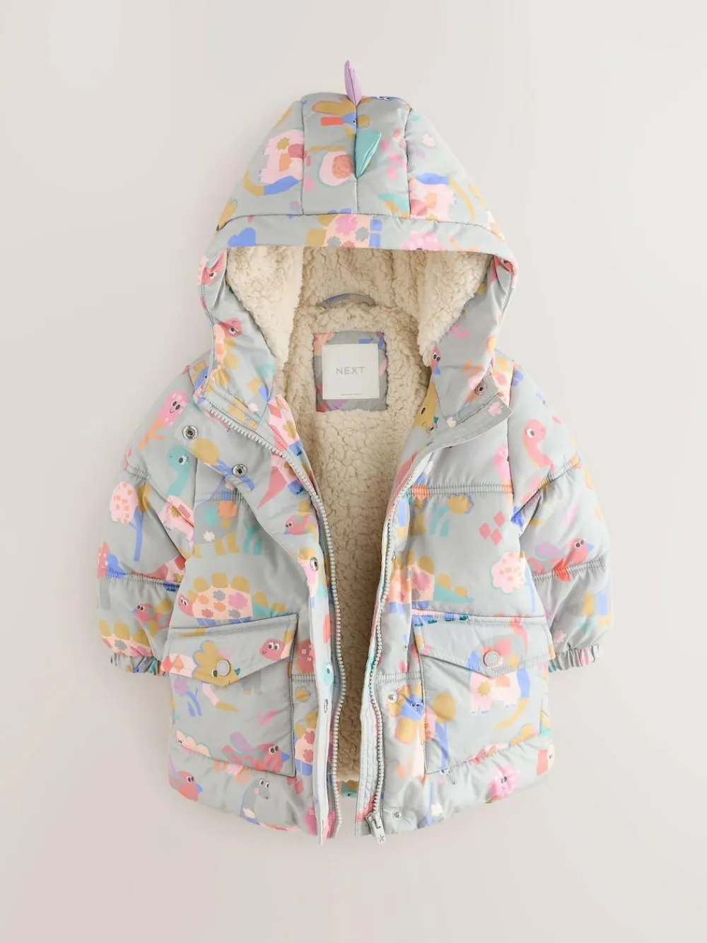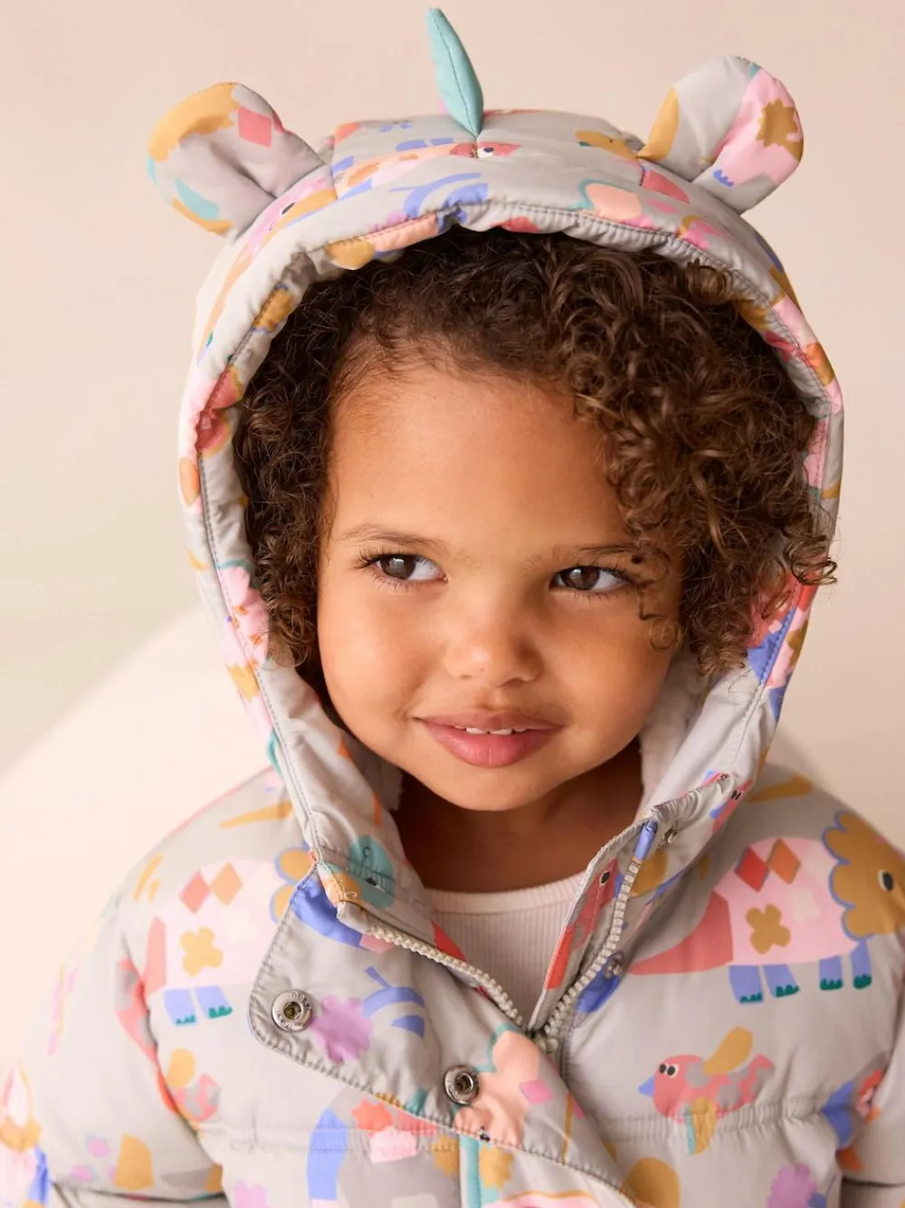 Keep them warm and dry with this adorable padded coat. The shower-resistant fabric and cosy borg lining provide warmth on cooler days, while the playful 3D character ears on the hood add a fun touch. With fleece-lined pockets, it is a practical and stylish choice for their outdoor adventures. Shower resistant Borg lined Fleece-lined pockets 3D character ears Padded Heavyweight All-over floral print Zip and snap button fastening Machine washable. Main 100% Recycled polyester. Lining 100% Recycled polyester. Wadding 100% Recycled polyester.