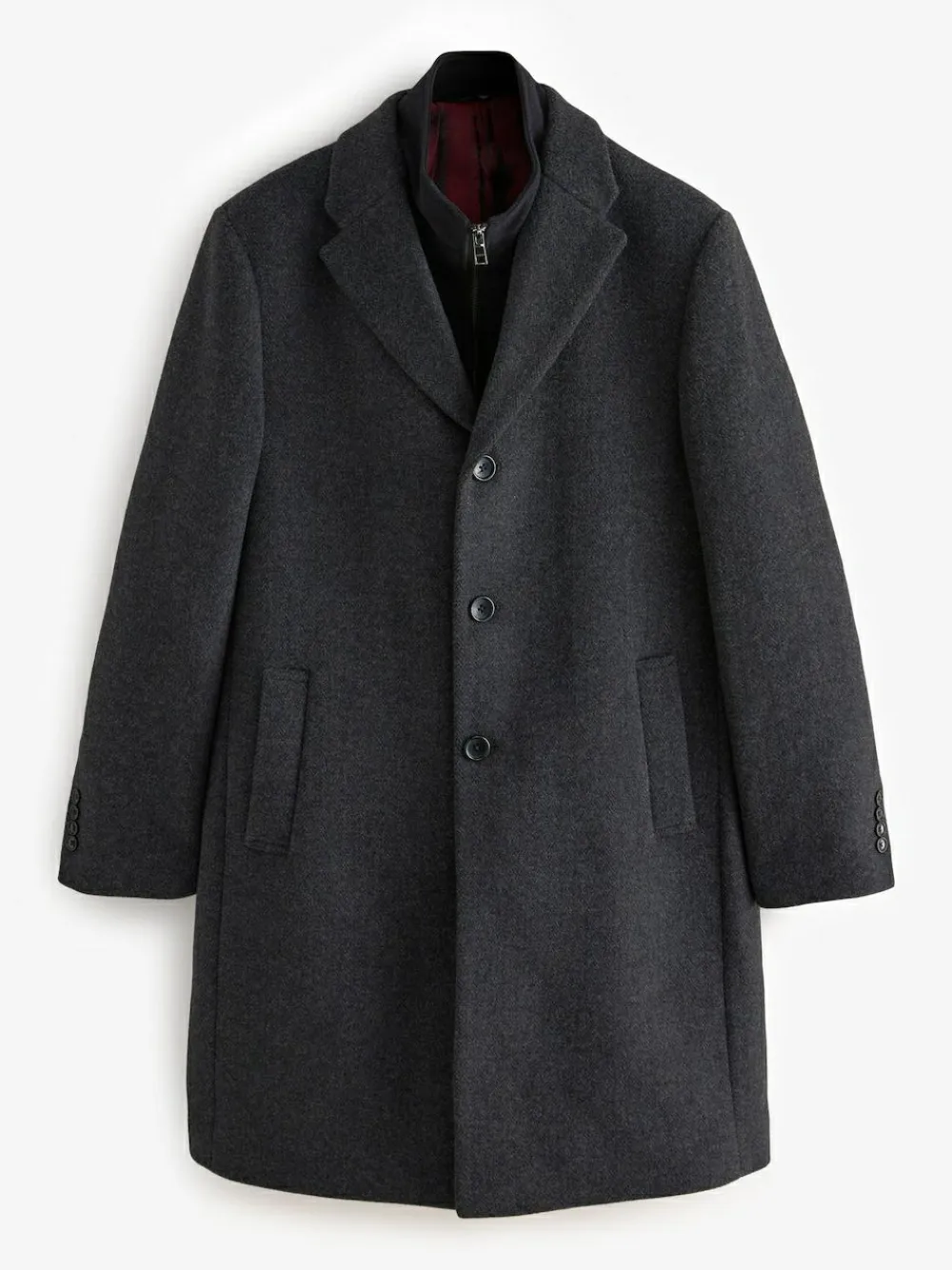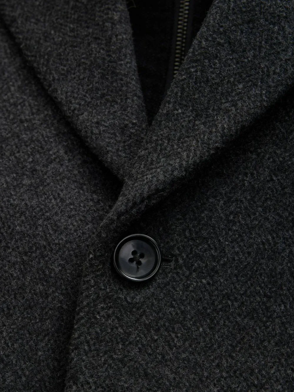 As part of our Signature selection, this stylish and smart-look charcoal grey coat is made from a wool-blend fabric with textiles from the Nova Fides Italian mill, with a textured moleskin zip mock gilet for a layered look. The coat is finished with a notched lapel collar, side pockets, a smooth lining and 3M insulated padding.Nova FidesSince the 1960s, Nova Fides has been based in the Prato textile district creating fine weaves and fabrics for Men’s clothing. Signature collection Wool-blend fabric Textiles from the Nova Fides mill Moleskin zip mock gilet Button-up fastening Notched lapel collar Smooth lining Side pockets Dry clean only. Main 57% Wool, 26% Nylon, 8% Cashmere, 5% Acrylic, 4% Other fibres. Body Lining 57% Polyester, 43% Viscose. Sleeve Lining 100% Polyester. Insert 94% Cotton, 6% Polyester. Wadding 78% Recycled polyester, 22% Polyester. 3M Thinsulate Insulation – Lightweight, warm, moisture resistant and breathable. Hypoallergenic and designed to maintain warmth.