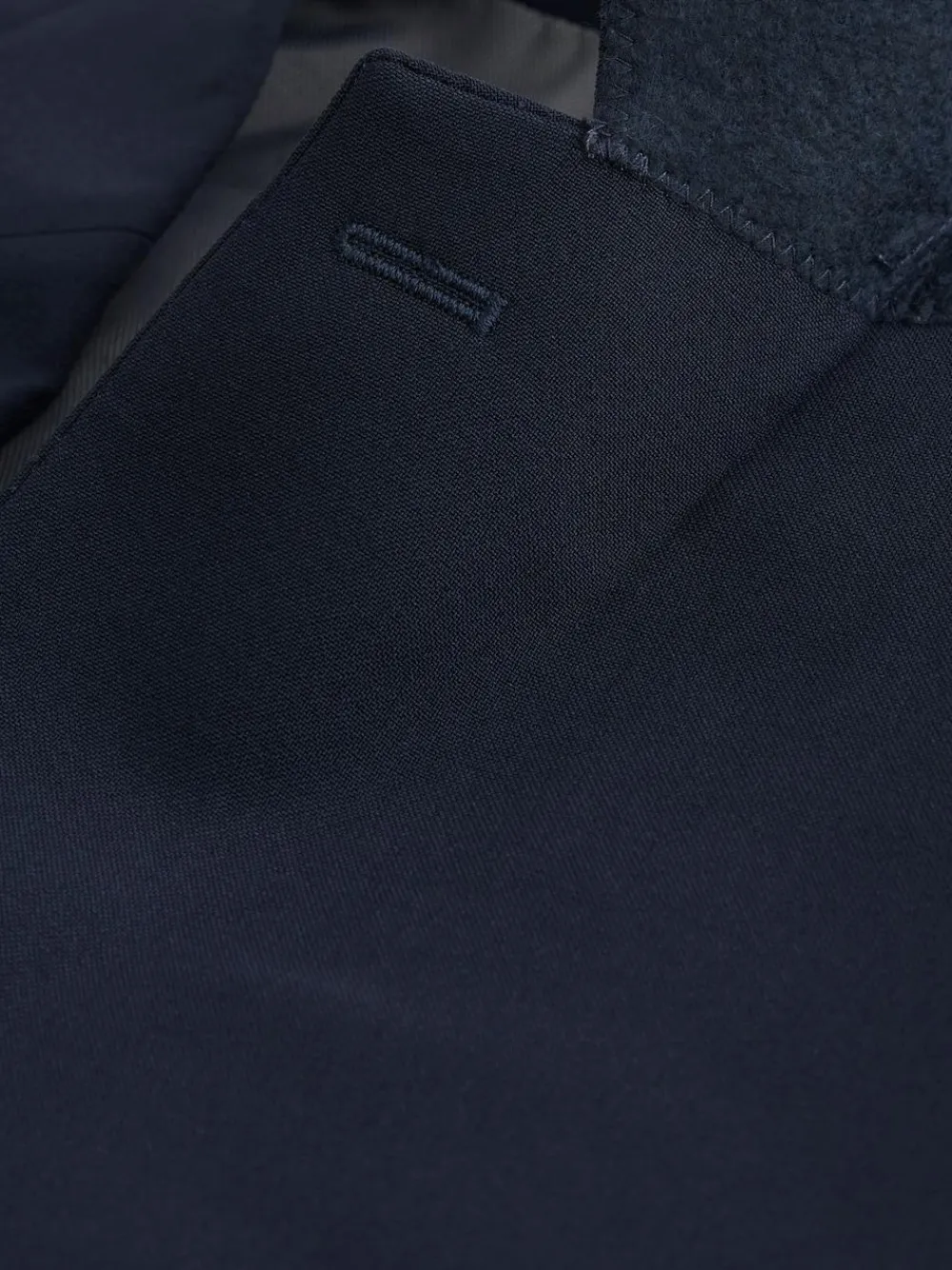 Handle a smart dress code in style with our Essential suit jacket in navy blue. Featuring a single breasted cut with two front pockets, buttoned sleeves and a smart notched lapel collar. Smart, easy to wear and guaranteed to draw good attention, style with a shirt and tie or dress down with a fine knit for endless appeal. Suit jacket Slim fit Single-breasted Chest pocket Buttoned sleeves Notched lapel collar Main 100% Recycled polyester. Lining 100% Polyester.