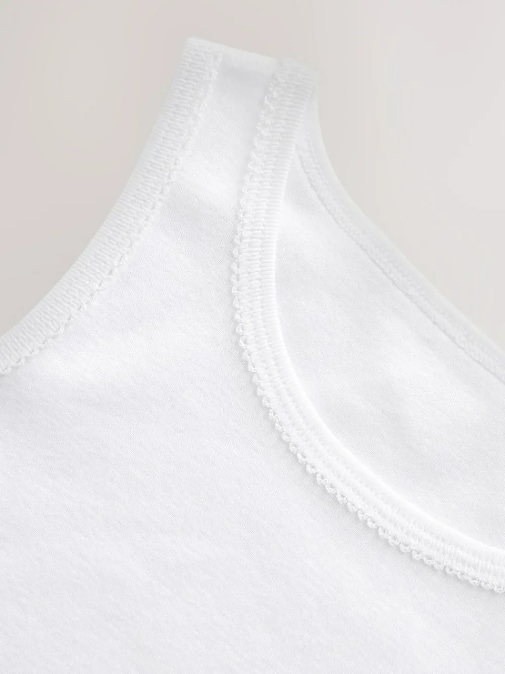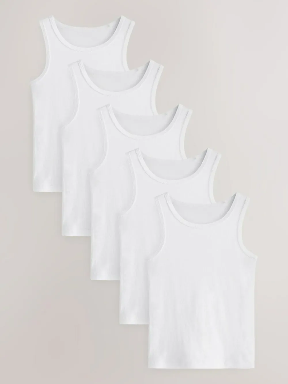 Perfect for stocking up on style staples, this 5-pack of white vests is crafted from 100% cotton with a round collar, wide shoulders and a high back. Five-pack 100% Cotton Round collar Wide shoulders High back 1×1 rib fabric Machine washable. 5 x Vest 100% Cotton.