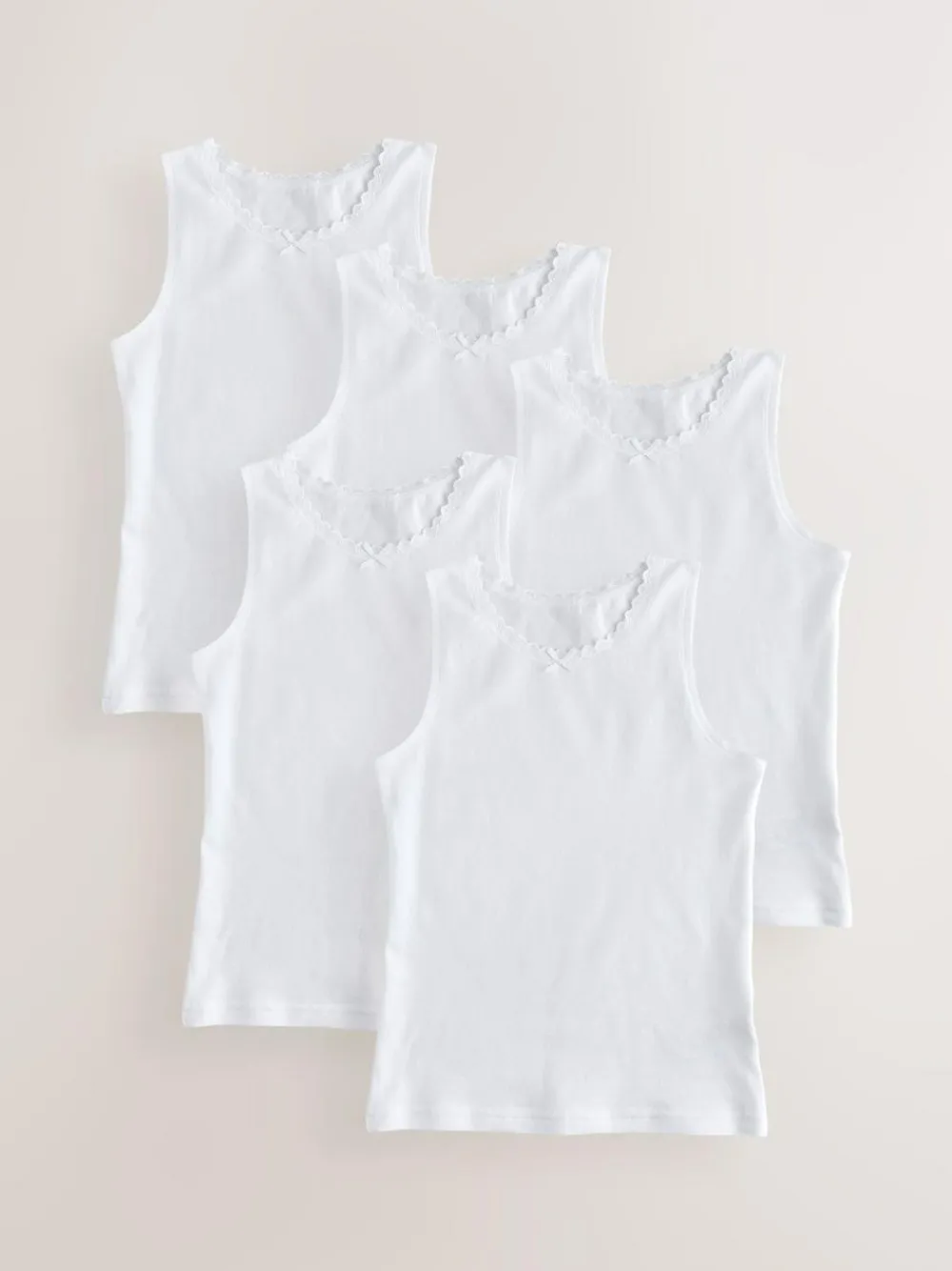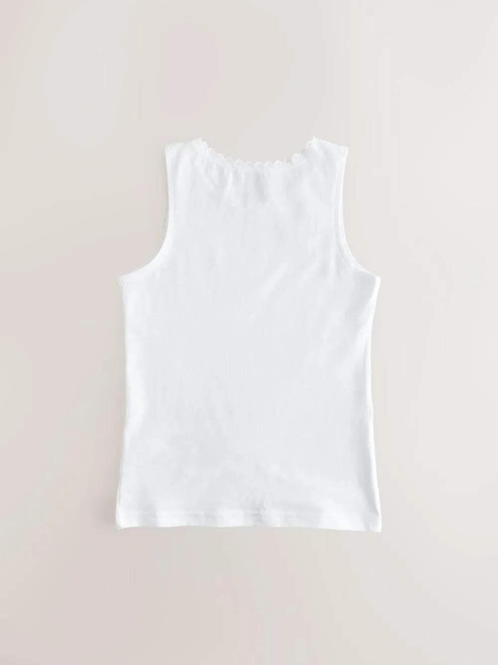 Our 5 pack of white vests are cut in a long length with wide shoulder straps and a high back shape. Complete with lace trim and detailing. 5 pack Cotton rich High back shape Lace detailing Machine washable. 5 x Vest 95% Cotton, 5% LYCRA® XTRA LIFE™ elastane. LYCRA® XTRA LIFE™ fibre keeps your underwear looking new for longer, with lasting comfort and fit. This innovative stretch fabric is lightweight and breathable and will hold its shape wear after wear, wash after wash.