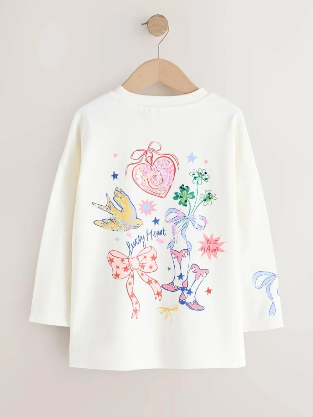 Add a touch of sparkle to her everyday look with this charming white long sleeve top. Designed for ages 3-16 years, it features a classic crew neck and eye-catching sequin details on the front. The playful design is complemented by a standout back graphic, making it a trendy choice for her wardrobe. Eye-catching sequin detail Statement back graphic Classic crew neck style Long sleeve design 95% Cotton, 5% Elastane.