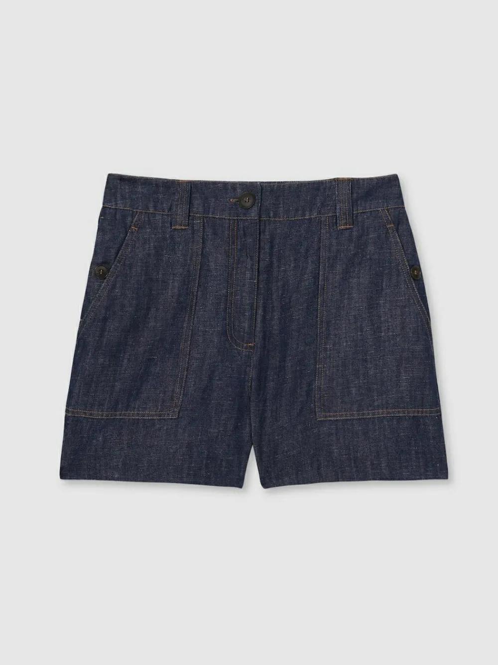 The Indigo Ashby shorts embrace effortless off-duty style with their wide-leg silhouette and breathable 100% linen construction. The lightweight chambray fabric enhances their relaxed, holiday-ready feel, while horn-effect buttons lend a refined finish. 100% Linen Chambray fabrication Side buttoned pockets Angled front patch pockets Patch pockets to reverse Front button and zip The model is wearing a size 8. Measurements of the model: Height 5ft 10” / 178cm. Regular inside leg length 3″ / 8cm. Machine washable. 100% Linen.