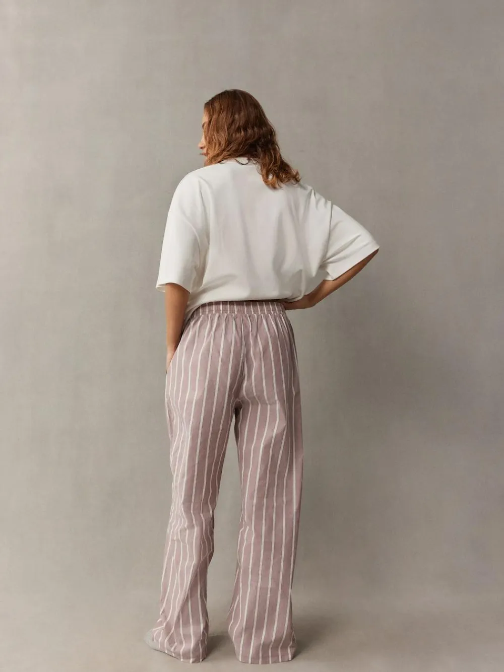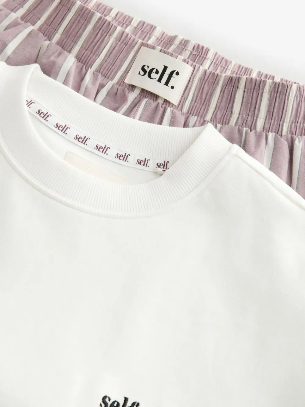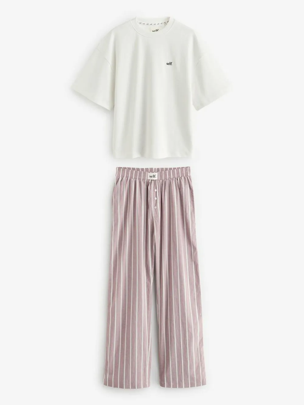 Make bedtime as stylish as your daytime look with our self. pyjamas. The classic two-piece set made in a soft cotton offers a relaxed fit ideal for slow mornings and cosy evenings and it includes a heavyweight crew neck t-shirt that has the self. logo embroidered on the chest. The t-shirt is paired with wide leg striped trousers that are fitted with an elasticated waistband for a comfortable fit, pockets and a self. branded badge on the front. 2 piece set 100% cotton Heavyweight crew neck t-shirt Elasticated waistband Pyjama Top and Pyjama Bottom 100% Cotton. Warning: Keep away from fire and flames., Our tall collection is designed to fit women 5’10” and above. This has been proportionally increased through the body, leg and sleeve to achieve the perfect fit. Available in sizes 8-20.