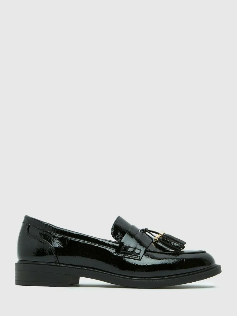 The schuh Layne Patent Tassel Loafers arrive with a wide fit silhouette! Featuring a durable construction and easy slip-on design, while the sleek black colourway delivers a smart and timeless look that’s perfect for school styling. Heel height 1cm. 99% Polyester, 1% Metallised fibre.