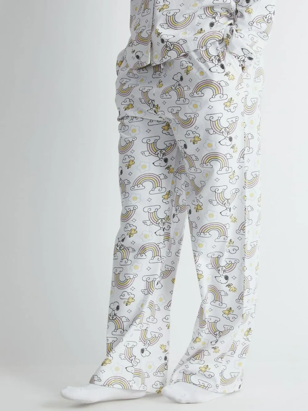 Embrace cozy comfort and a pop of color with the Skinnydip Peanuts x Skinnydip Snoopy Rainbow Print Pyjama Set in Ecru. This playful set brings the beloved Peanuts character, Snoopy, into your loungewear collection with a cheerful rainbow print Machine washable. 100% Cotton.