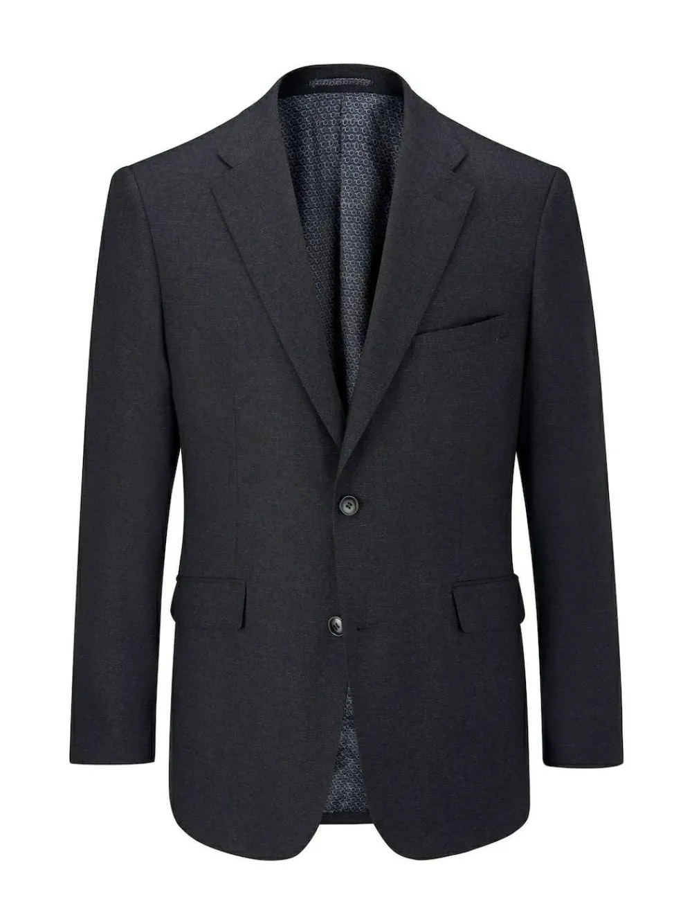 I’m Methley, a single-breasted, tailored fit, suit jacket, crafted from a black semi-plain cloth. You will always look the part when you’re wearing me, whether it’s to a business meeting or dinner party. My black horn effect buttons and geometric print lining are the perfect finishing touches to this classic suit jacket. My features include, single breasted two button fastening, flap waist pockets, notch lapels, classic black horn buttons, geometric print lining, pull out hankie with twin side vents. See my matching Methley tailored trousers and waistcoat to complete the look. Dry clean only. 68% Polyester, 30% Viscose, 2% Elastane.