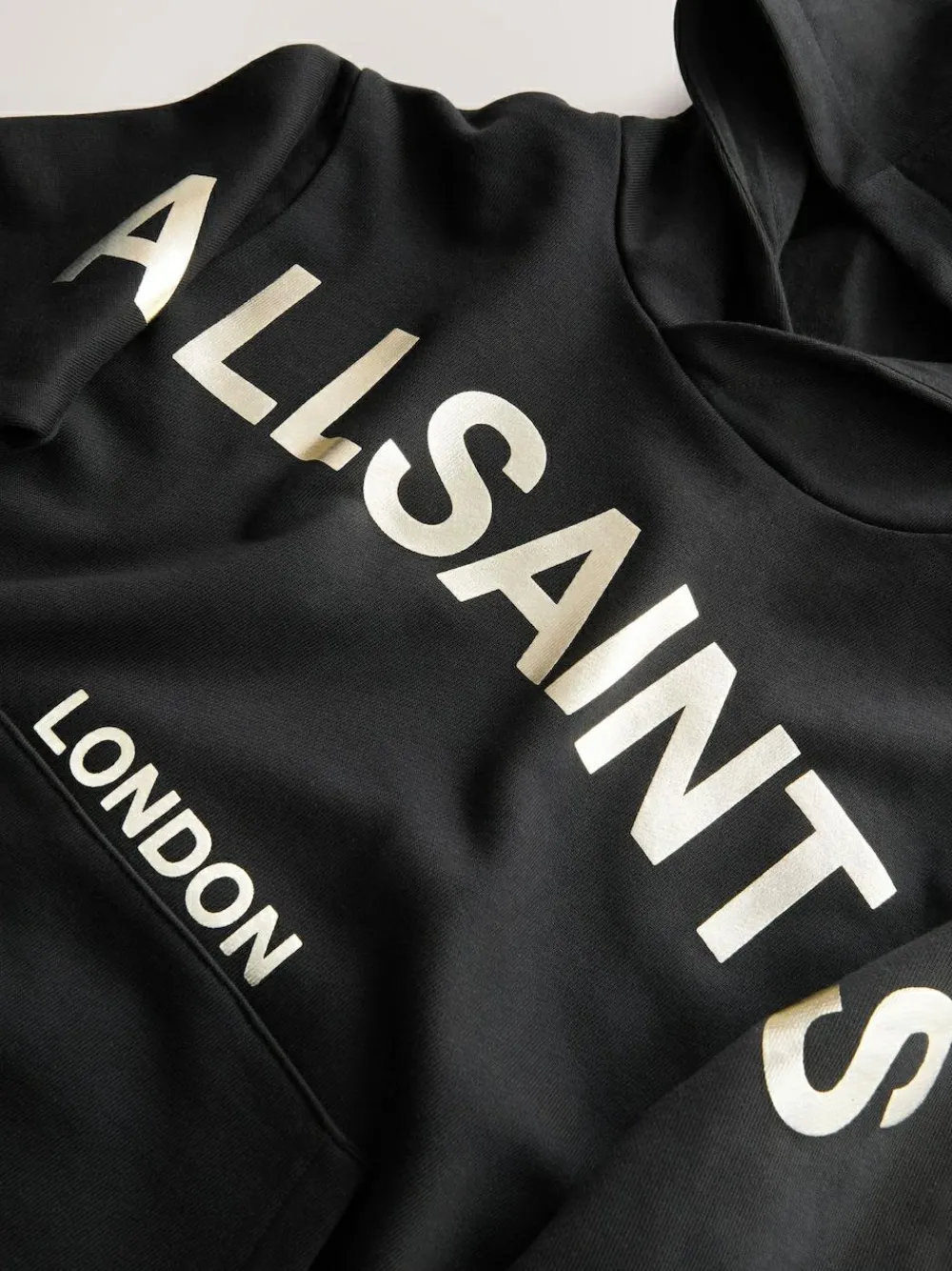 Check out this statement smALLSAINTS Black Gold Biggy Oversized Pullover Hoodie. This hoodie is the definition of cool and comfortable, crafted from soft 100% cotton and designed in an easy oversized fit. It features a bold, metallic Biggy AllSaints logo printed across the front in a striking gold finish. Practical features include a cosy hood, long sleeves and a convenient kangaroo pocket, making it an essential piece for everyday style. Biggy AllSaints logo Metallic print Kangaroo pocket Oversized fit Machine washable. Main 100% Cotton. Rib 95% Cotton, 5% Elastane. Lining 100% Cotton.