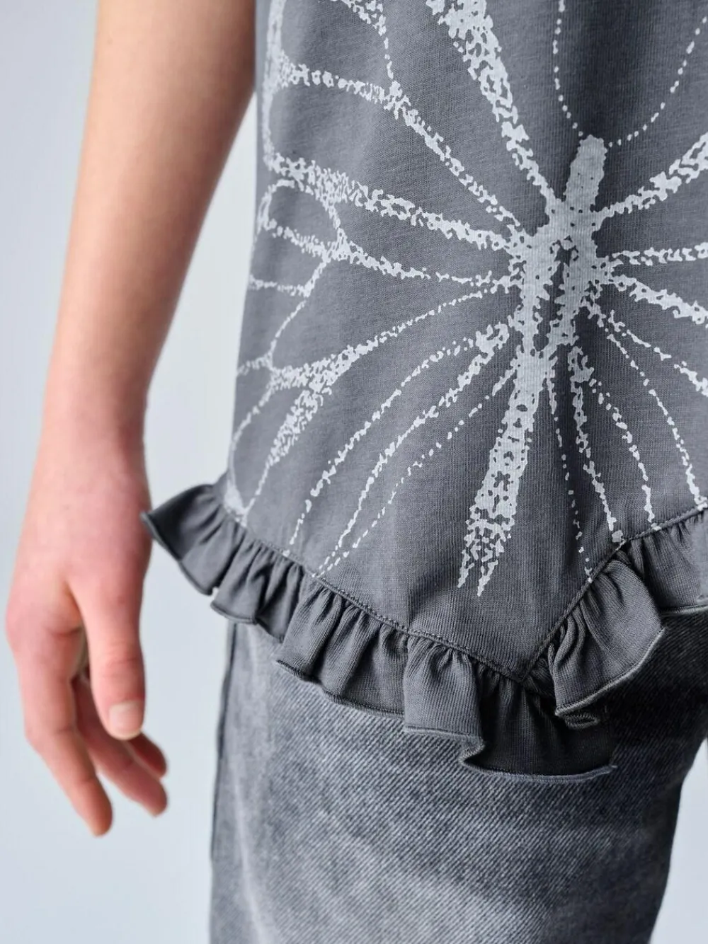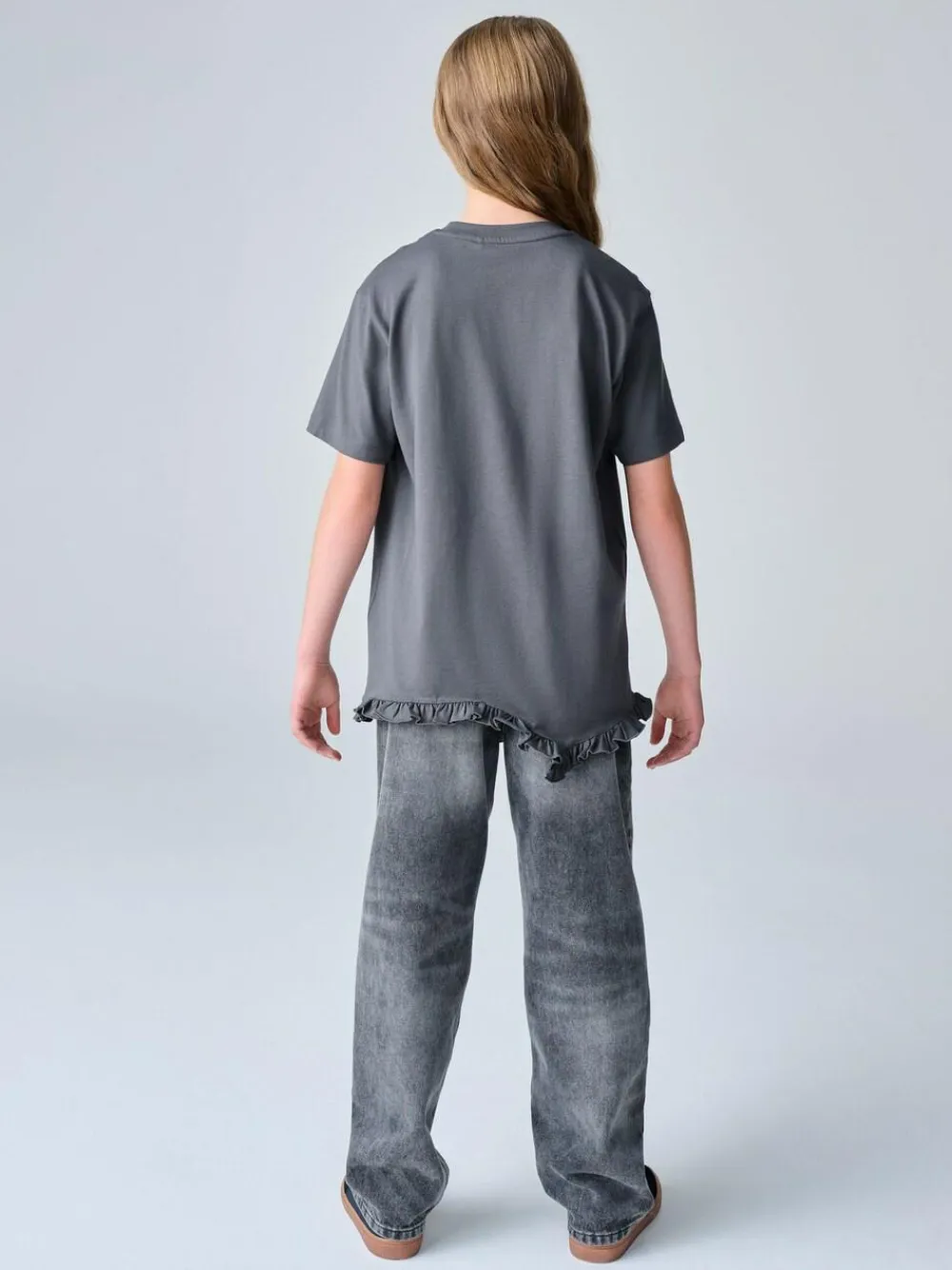 Refresh their casual rotation with the smALLSAINTS Charcoal Grey Asymmetric Hem Crew Neck Cotton T-Shirt. Crafted from 100% cotton for a soft and premium feel, this top features a striking butterfly graphic and the iconic AllSaints logo at the front. The design is defined by a unique frill asymmetric hem, which adds a playful, modern twist to the oversized, relaxed fit silhouette. Finished with a classic crew neck and short sleeves, this versatile piece is perfect for creating an effortlessly cool weekend look. Relaxed fit Frill asymmetric hem Butterfly graphic AllSaints logo at the front Machine washable. Main 100% Cotton. Neck 97% Cotton, 3% Elastane.