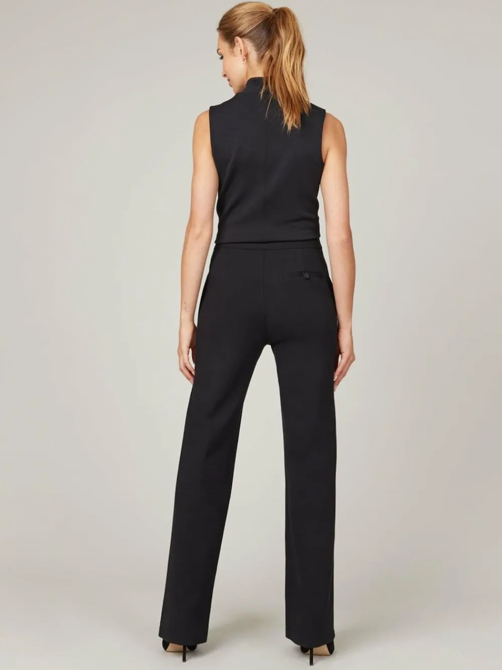 This smoothing pant comes in our premium ponte fabric with targeted compression built in, powered by SPANX CoreSure Tech™. With comfortable 4-way stretch and a high rise waist, this wide leg pant will have you feeling smooth from tummy to hip, and oh-so-comfortable throughout the wide leg. No zippers, no buttons, and no pockets (so no bulk!) at the hips—all for the ultimate smoothing effect. 86% Cotton, 14% Nylon.