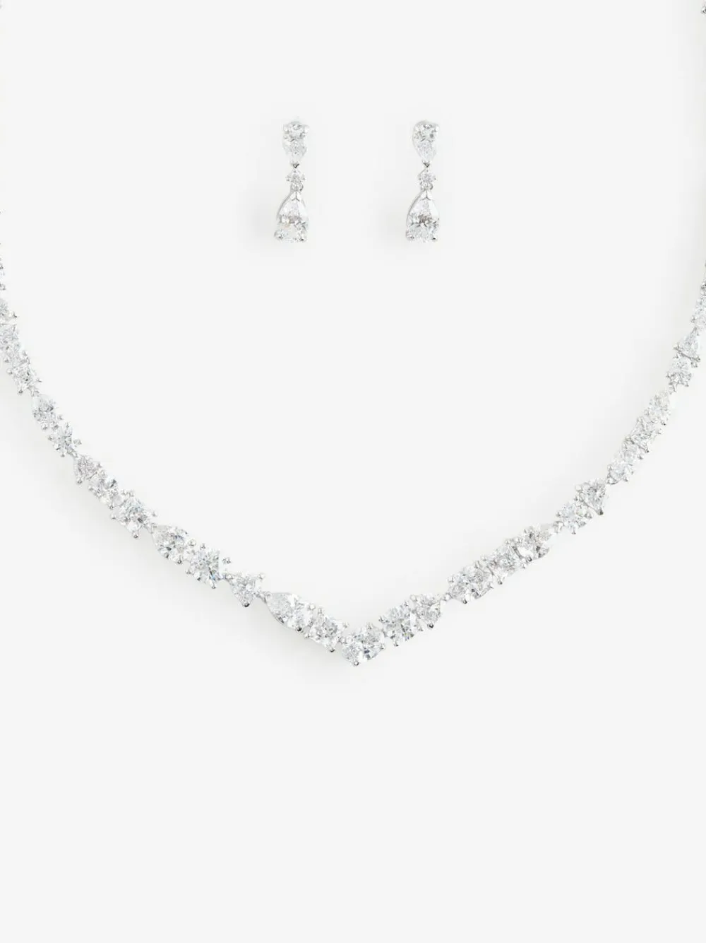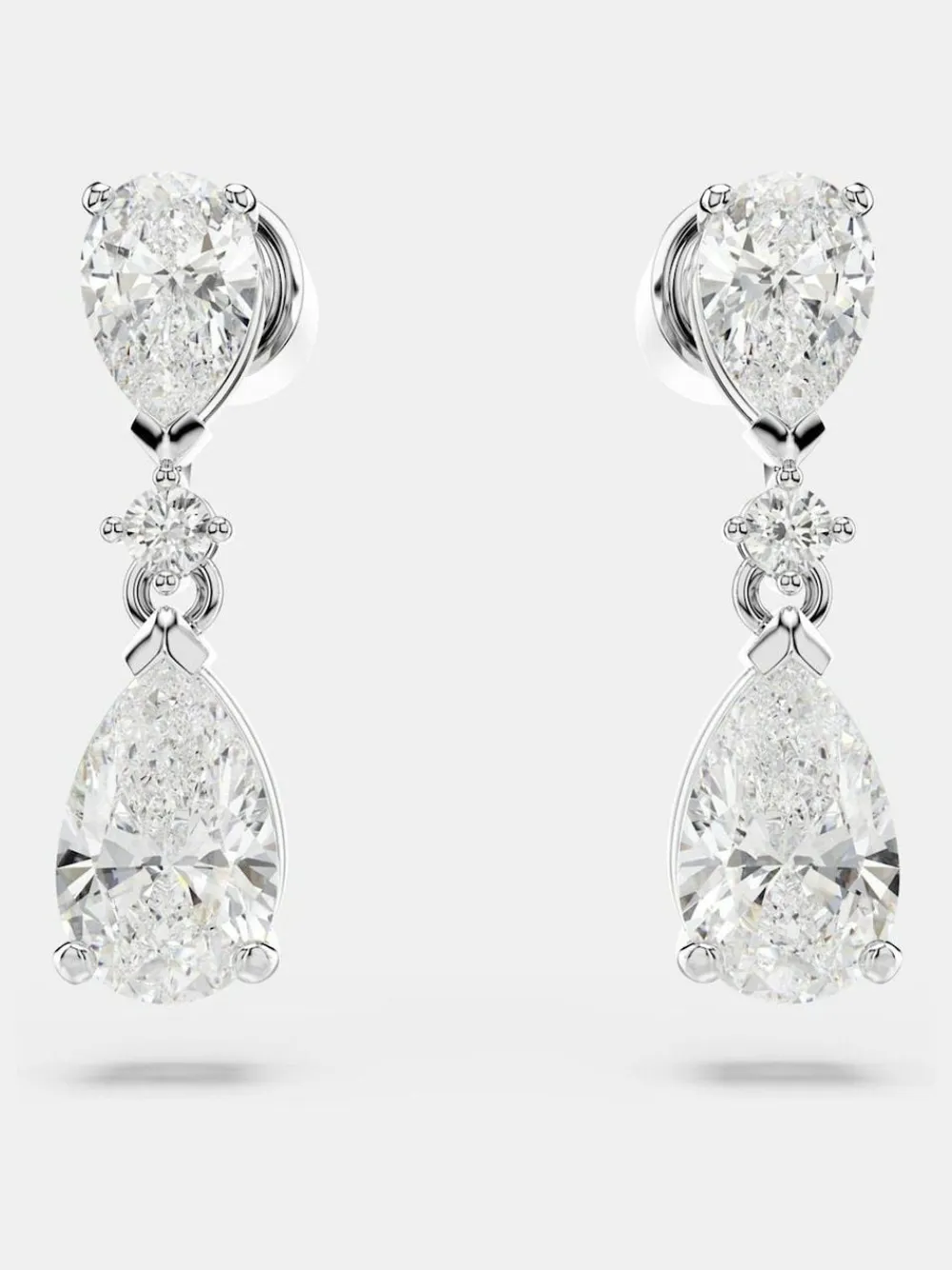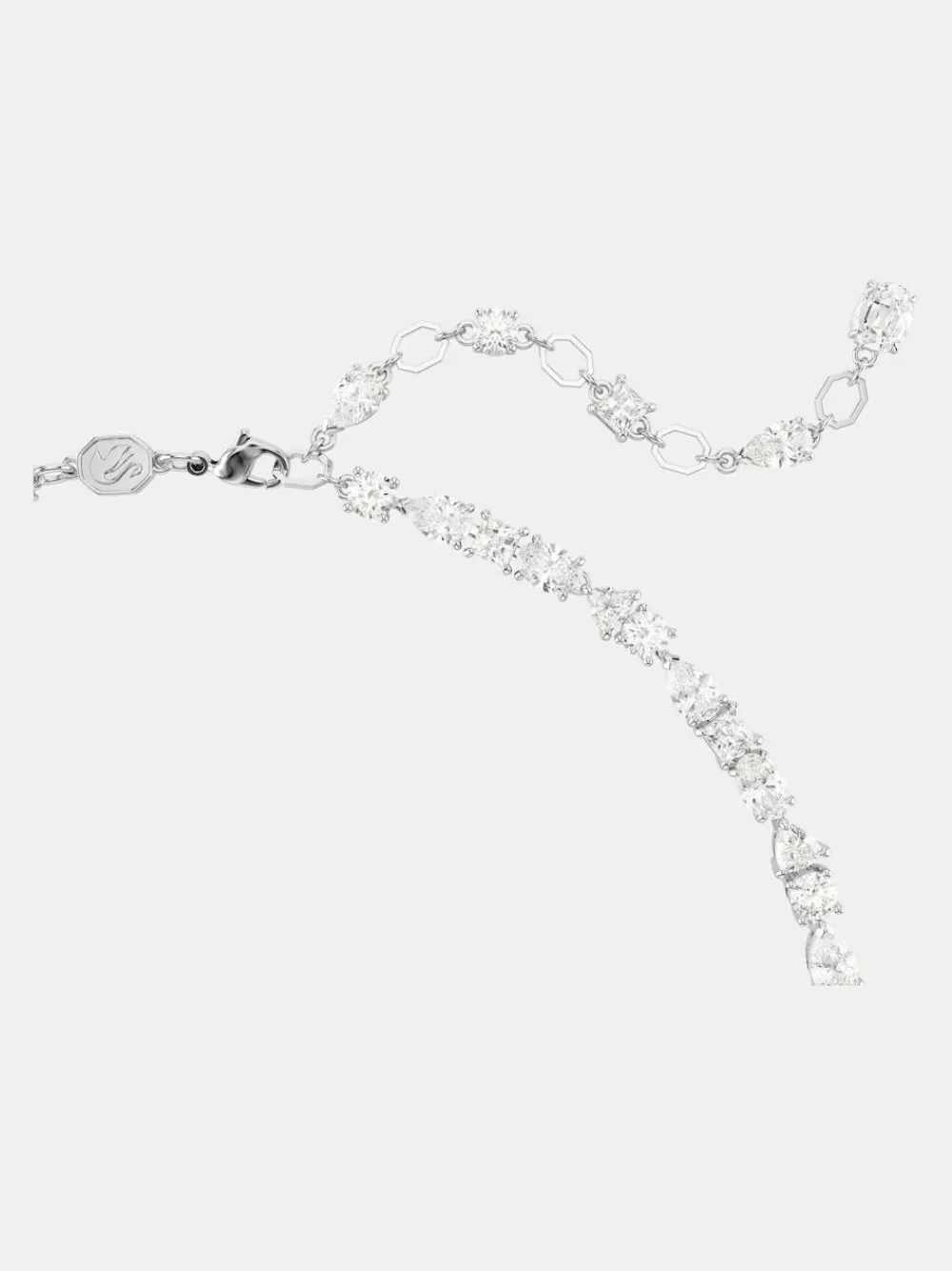 Exquisite refinement is brought to life in this show-stopping jewelry set from the Mesmera family. The necklace is made with a string of eye-catching Swarovski Zirconia on a rhodium plating setting, all produced in a surprising mix of cuts and sizes. For extra luxury, the elongation is completed with a lobster closure and a scattering of Swarovski Zirconia. The light-catching earrings are also rhodium plated, with a bold hanging design featuring luminous pear-cut crystals. Gift this set to a loved one and instantly ignite their style. 100% Brass.