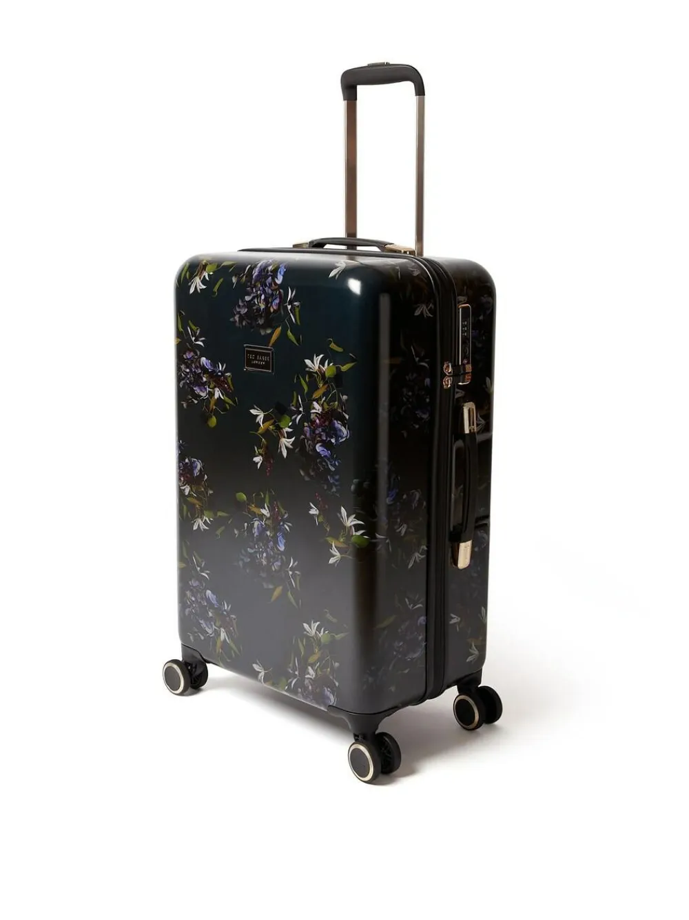 Midnight Bloom luggage collection by Ted Baker captures the quiet drama of unfolding petals with a rich, moody palette of deep florals. Finished with Ted Baker’s signature gold details and a sculpted, structured form, this 4-piece travel collection includes a Vanity Case, Cabin, Medium, and Large Suitcase and brings impact to every journey. Details include a signature print lining with an organised interior to make packing easy, an embedded TSA lock, and double wheels with branded wheel caps. Height 68cm Width 45cm Depth 28cm 100% ABS (Acrylonitrile Butadiene Styrene).