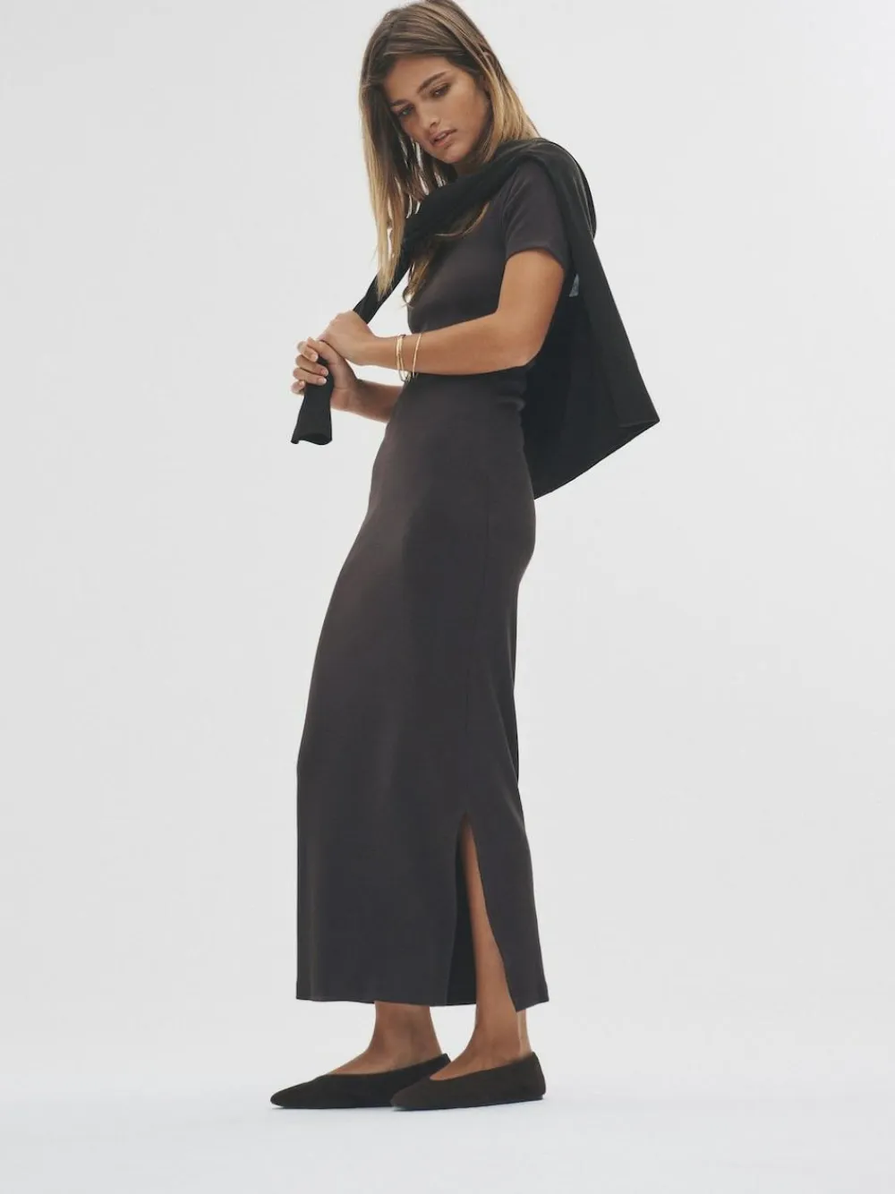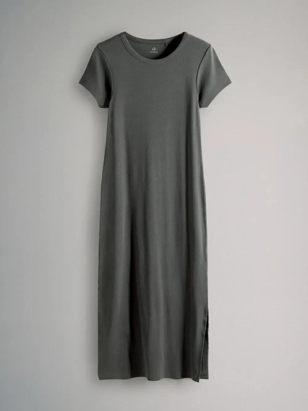 Refresh your casual dress collection with THE SET 3 Pack Short Sleeve Ribbed Midi Dresses. Including three core neutral colours: classic black, rich chocolate and deep charcoal. Each dress is crafted from comfortable ribbed fabric, offering a flattering, close fit. They feature a simple crew neck and short sleeves, making them perfect for warmer weather or layering. The midi length is finished with a neat split hem, adding movement and contemporary detail. 3 pack Midi length Rib fabric 3 x Dress 95% Cotton, 5% Elastane.