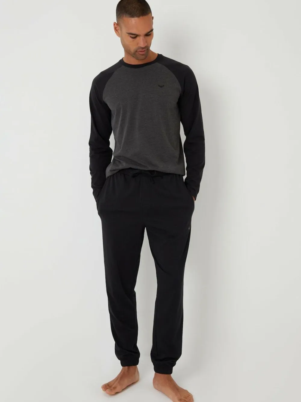 Get ready to relax in this two-piece loungewear set from Threadbare. This set consists of a long-sleeve, contrast raglan sleeve top and a pair of long, joggers-style trousers. The pyjama trousers feature two side pockets, an elasticated waistband with branded drawcords, and elasticated cuffs. Made in a super soft, cotton-blend jersey for comfort and easy care. This set is perfect for lounging at home or as a cosy bedtime outfit. Machine washable. 60% Cotton, 40% Polyester. Warning: Keep away from fire and flames.