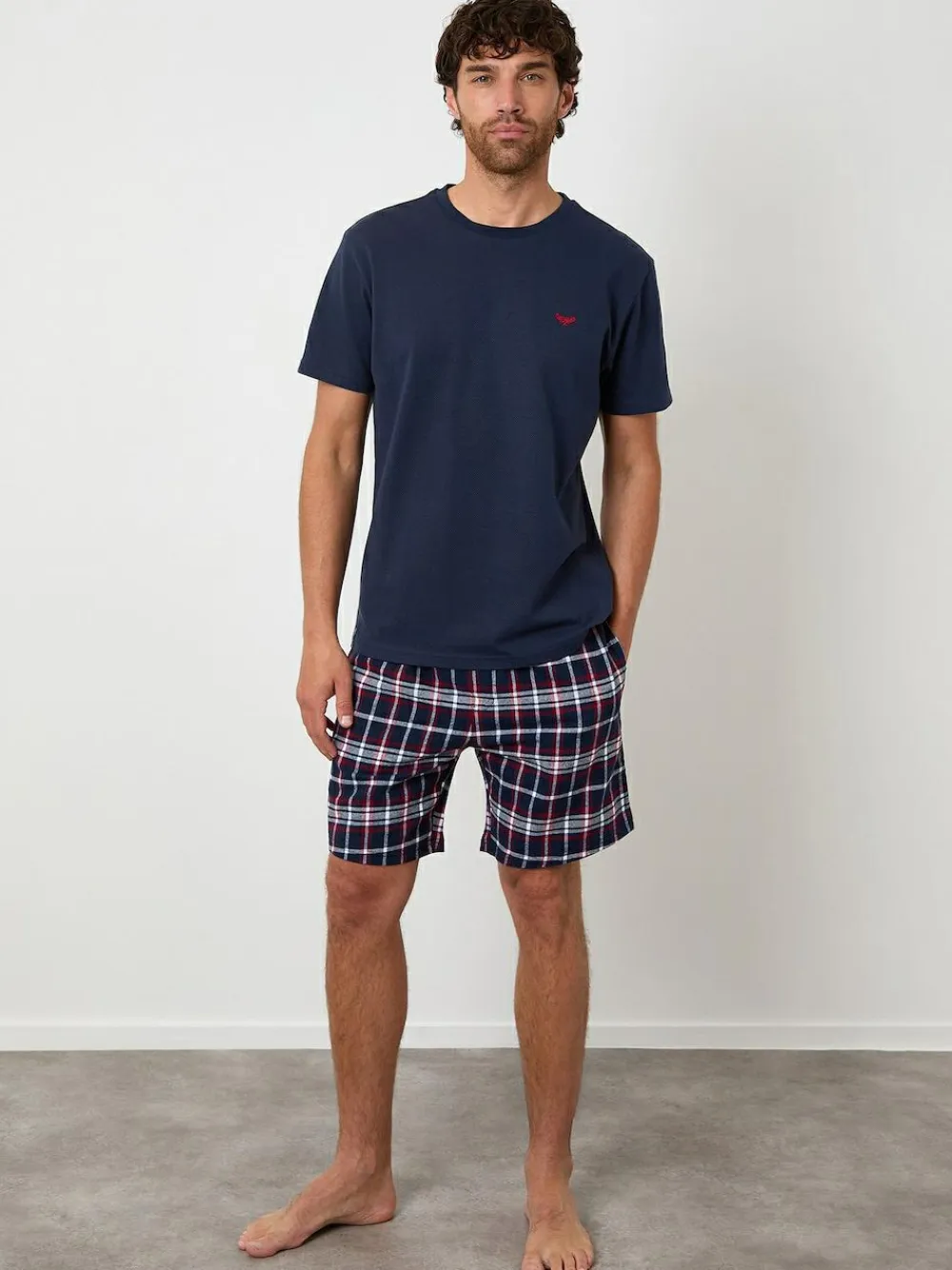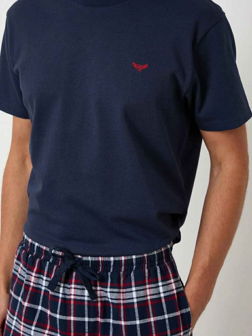 Lounge in comfort with this two piece shortie pyjama set from Threadbare. 2-piece set 2 pack. Short sleeve T-Shirts. 1 textured, 1 plain. Embroidery on chest. Ribbed crew neck. Brushed check shorts with elasticated waistband and drawcords. Side entry pockets. Machine washable. Main 60% Cotton, 40% Polyester. Bottom 100% Cotton.