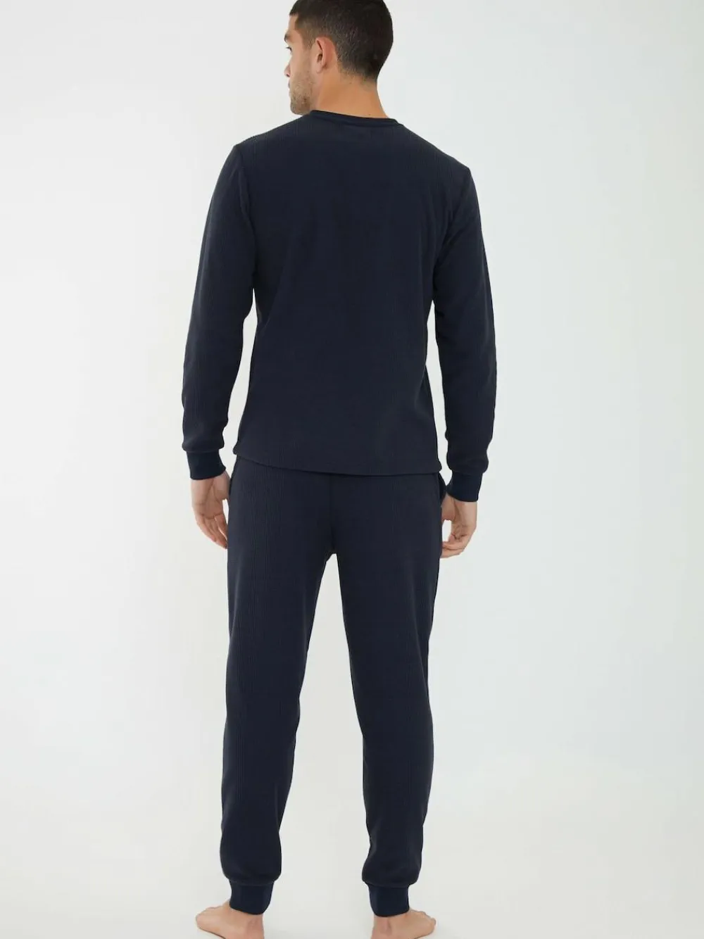 This cosy loungewear set from Threadbare, made from a waffle texture fleece, has a long sleeve top with ribbed crew neck and cuffs, and long pants with an elasticated waistband, drawcords, elasticated cuffs, and two side pockets. Ideal for keeping you warm as the temperature drops. A perfect loungewear item to keep you warm and cosy. Machine washable. 100% Polyester.