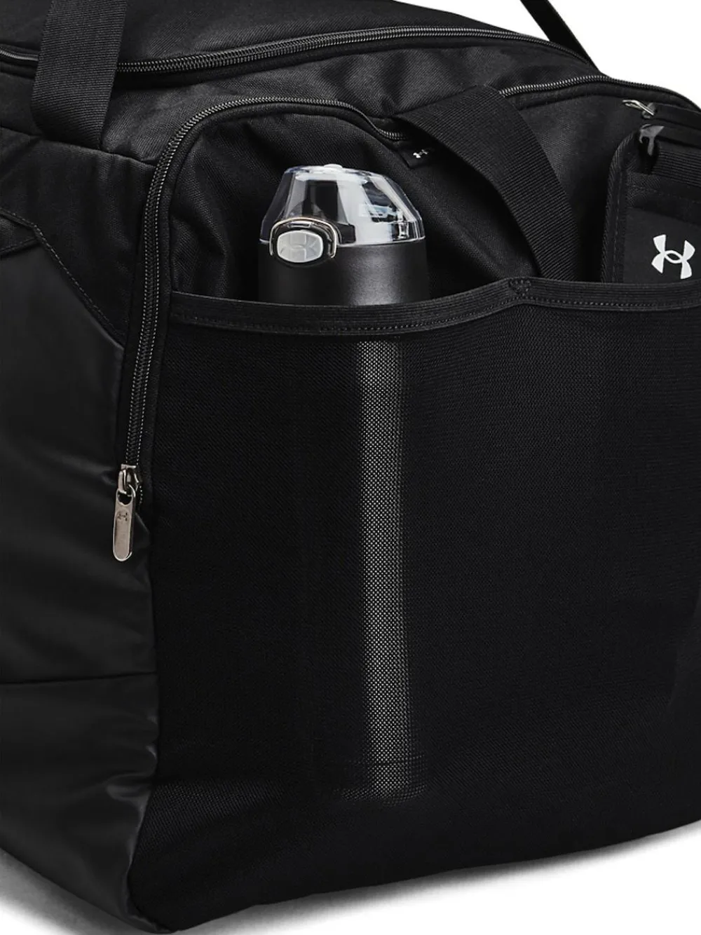 UA Storm technology delivers an element-battling, highly water-repellent finish Tough, TPU-coated & foam-lined bottom & side panels for added durability & structure Dual water bottle slip pocket Large vented pocket for laundry or shoes & internal slip pockets for organization Large front zippered organization pocket & molle webbing attachment points Removable, padded, HeatGear® shoulder strap easily stows away in side pocket Padded top grab handle Comes in black 100% Polyester.