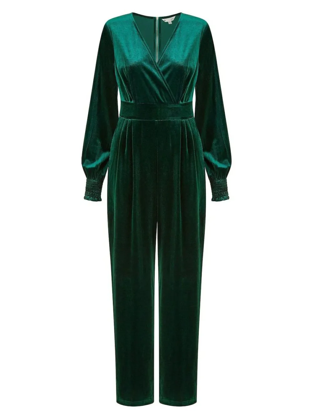 Get ready for the Christmas season in a fabulous floor-length jumpsuit. This one from Yumi has it all, long sleeves, a wrap neckline and a waited belt that ties in the back. The opulent velvet fabric is sumptuous and soft making this garment super comfortable as well as mega stylish. Regular inside leg length 58.5″ / 148cm. Machine washable. 95% Polyester, 5% Elastane.